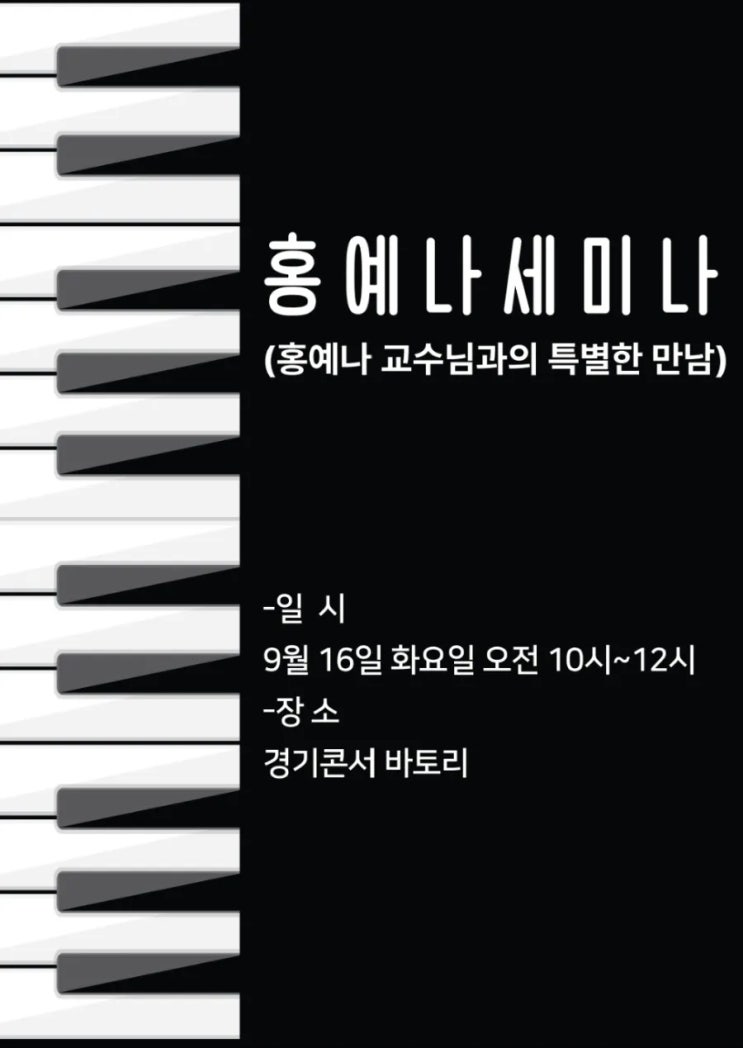 경기콘서바토리에서 열린 홍예나 교수님 세미나 (홍예나 교수님과의 특별한 만남) 에 다녀왔습니다. 세미나 두시간이 정말 순식간처럼 지나갔어요☺️ 아이들 하나하나에 실력에 맞는 연주곡들을 추천해 주시고 직접 들려주셨는데요 교수님 연주도 너무 멋있었답니다. 세미나를 마치고 돌아오면서 앞으로는 단순히 피아노를 ‘가르치는 사람’이 아니라 아이 한 명 한 명의 마음을 읽고, 그들의 속도에 맞춰 함께 걸어주는 선생님이 되어야겠다고 다짐했습니다. 앞으로도 끊임없이 배우고 성장하면서, 아이들에게 좋은 선생님으로 기억될 수 있도록 노력하겠습니다. 귀한 깨달음을 주신 홍예나 교수님께 진심으로 감사드립니다 #고....... <img src="https://blogthumb.pstatic.net/MjAyNTExMjRfMzAw/MDAxNzYzOTU3MTA4ODk5.ZkSR-9qXICScglWIBZZkd0b3R0s4l0MlLqf4hbYTn28g.s7FIPbw1HaQ9TRBjWOcW-CNUoc5DsdISy14clBbybgYg.JPEG/1763956584181.jpg?type=s3" />