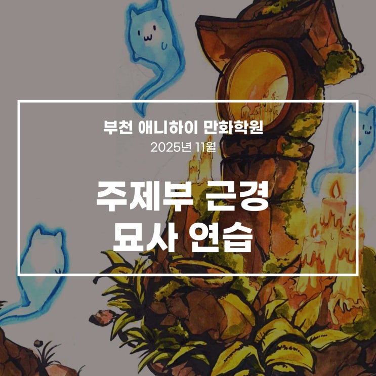 안녕하세요. 부천 애니하이 만화 학원입니다! 한 해를 마무리하는 차가운 공기가 조금씩 느껴지는 요즘, 우리 학생들은 흔들림 없이 자기 자리에서 차근차근 실력을 쌓아가고 있습니다. 오늘은 입시기초반에서 진행된 근경 주제부 수업을 소개해드릴까 합니다! 상황표현 수업의 일환으로 근경 중심 주제부 구성을 진행했습니다. 이번 수업에서는 짧은 시간 안에 이야기 흐름이 느껴지는 공간을 어떻게 시각적으로 구성할지에 대한 고민을 담았습니다. 또 근경을 중심으로 화면을 설계하면서 이야기의 출발점이 되는 요소를 명확하게 배치하고 묘사하는 법을 연습하는 것이 목표였습니다. 많이 쓰이는 자연물을 연습했습니다. 같은 주제여도 학생....... <img src="https://blogthumb.pstatic.net/MjAyNTExMjhfMTU1/MDAxNzY0MzE2NjAzOTM0._FMyfIjbhsy9JT08NeSocjNnciKuB6Prvu0-4RsWOxEg.ptcRGQrVIrFfABOewpixFvy0u_Ngs3G0gQsW3cFA2kUg.JPEG/%BA%CE%C3%B5-%BE%D6%B4%CF%C7%CF%C0%CC-%BA%ED%B7%CE%B1%D7-%BD%E6%B3%D7%C0%CF.jpg?type=s3" />