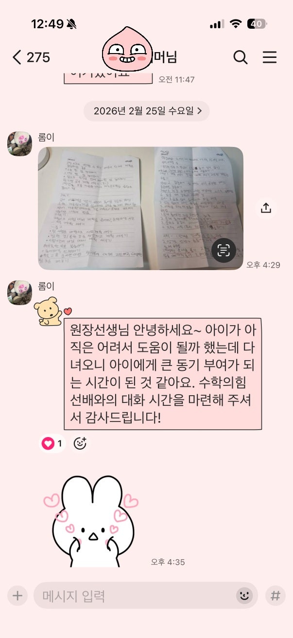 ️ 청솔학원 재원생 출신 이투스 메이트 2기가 전하는 후기 4탄 청솔학원 질의응답 시스템 & 성적 변화 후기 안녕하세요 ! 개인별 맞춤 학습 시스템의 원조 청솔학원입니다 ☺️ 재수는 결국 의지 싸움이 아니라 시스템 싸움이라는 말이 있기도 하죠 혼자 공부하면 질문은 미뤄지고, 오답은 쌓이고, 루틴은 쉽게 무너집니다. 하지만 ✔ 질문을 바로 해결할 수 있는 환경 ✔ 하루 공부를 기록하고 점검하는 구조 ✔ 정기적인 모의고사와 상담 시스템 이 세 가지가 갖춰지면 공부의 밀도가 달라지는데요 이번 1월 4주차 청솔학원 이투스 메이트 2기 후기는 그 ‘밀도의 변화’가 어떻게 성적 변화로 이어졌는지에 대한 이야기를 가져왔습니....... <img src="https://blogthumb.pstatic.net/MjAyNjAyMTlfNSAg/MDAxNzcxNDkwODYyMzY2.e2vttj5eljN6rmQB34fjk3zr2c0KctHT9f93vvVZCLkg.yPuT7qarsigiJGox7uIUNd-iEvWMYvLxsAihH6b9_50g.JPEG/20260110_090805816.jpg?type=s3" />