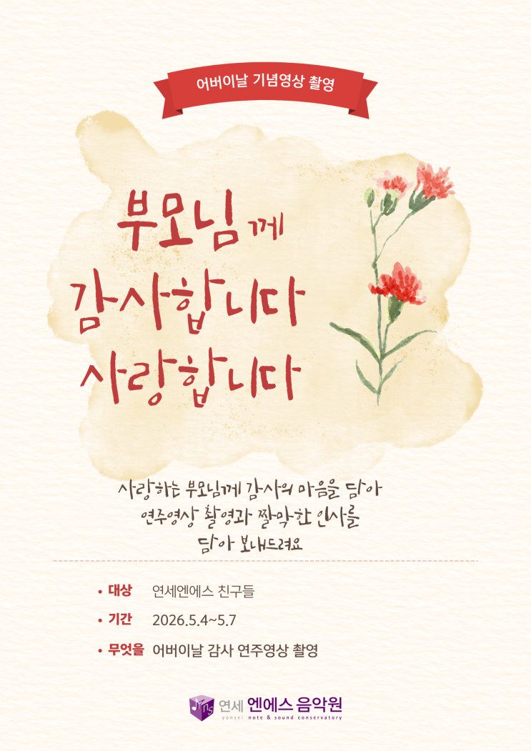 어버이날, 연세엔에스 키즈는 연주로 마음을 전해요 “부모님께 감사합니다, 사랑합니다” 연세 엔에스 음악원에서는 다가오는 어버이날을 맞아 아이들의 연주와 함께 감사의 마음을 담은 기념 영상을 준비하고 있습니다. 짧은 인사와 작은 연주이지만 부모님께는 오래도록 남을 따뜻한 선물이 될 것입니다. 2026.5.4 ~ 5.7 어버이날 감사 연주 영상 촬영 진행 올해 어버이날, 아이들의 진심을 담아 전해드리겠습니다 <img src="https://blogthumb.pstatic.net/MjAyNjA0MjhfMjY2/MDAxNzc3MzU4NDQ4OTMw.WfBgp6vdD9ZUC41JbMR9KML628rc6RFUVSovZVU605Qg.iOBsgW-BNUI2qVRulAfsrf-bTggID7Ge6M6z-xpaaoIg.PNG/KakaoTalk_20260428_154019412.png?type=s3" />