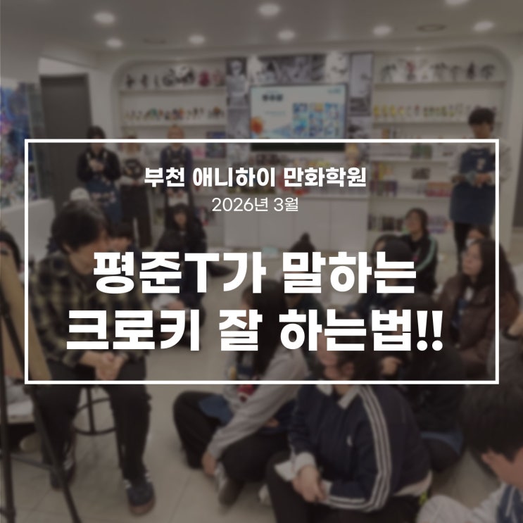 안녕하세요!! #부천만화학원 애니하이 입니다. 애니하이에서는 평준T와 함께하는 크로키 수업이 진행되었습니다. 사진에서 보시듯이, 평준T의 시범 하나하나를 놓치지 않기 위해 학생들이 둘러앉아 집중하는 모습이 인상적이네요~ 이번 모델 크로키 수업은 단순히 "빨리 그리는 그림" 이 아니라, 인체의 구조의 이해 중심, 무게, 동세의 흐름을 읽어내는 이 세 가지가 오늘 수업의 핵심이었습니다. 직접 보여주는 시범, 그리고 바로 적용하는 실습 #부천만화학원 애니하이에서는 박평준 선생님께서 아이들 앞에서 직접 시범을 보이며 선을 어떻게 시작하는지, 어떤 부분을 과감히 생략하고 어디를 강조해야 하는지 실전 입시에서 바로....... <img src="https://blogthumb.pstatic.net/MjAyNjAyMjhfMTk0/MDAxNzcyMjcyNzI2OTkx.4hJQAIUzUvu_4Ti8H3Fg9nGtSLQuP7sZEllpiOwafjYg.MeWtr6jkMQlqN9PIADUNSwCFR4rFe-PRsc7dI7D2fFUg.JPEG/%BA%CE%C3%B5-%BE%D6%B4%CF%C7%CF%C0%CC-%BA%ED%B7%CE%B1%D7-%BD%E6%B3%D7%C0%CF.jpg?type=s3" />
