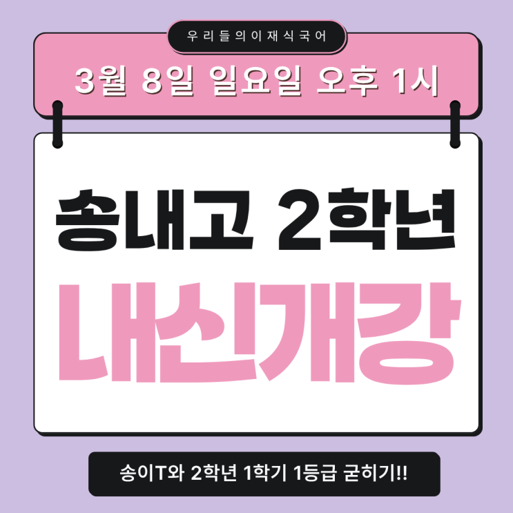 안녕하세요. 우리들의 이재식국어입니다. ^^ 송내고 2학년 단독 내신대비반 3월 8일 일요일 개강! 수능과 직결되는 1년, 이재식 국어학원의 완벽한 학습관리 시스템으로 내신 대비가 가능한 송내고 2학년 단독반을 소개합니다 송내고 2학년 시간표 & 담당 선생님 송내고 2학년 일요일 오후 1시~4시 수업은 주 1회 3시간 클리닉은 월 2회 90-120분 진행합니다. ⭐ 해당 학교의 내신 출제 경향을 정확히 분석 ⭐ 시험 문제의 포인트와 서술형 채점 기준을 구체적으로 지도 ⭐ 학생별 취약 영역(독서·문학·문법)을 장기적으로 관리 단순 시험 대비가 아니라, 학교별 시험 구조를 이해하고 전략적으로 준비합니다. 송내고 2학년 1학기 중간/기말....... <img src="https://blogthumb.pstatic.net/MjAyNjAyMjVfMjEx/MDAxNzcyMDA2NzcyMjM1.IypskYR5T9bEurqNkKf4R6QXrkzTxPx8QAGIZQ5_cq4g.IxEqk7go9c9De68AT7DyAzGt5nWjk1DZC79n-zrRBNog.PNG/%BC%DB%B3%BB%B0%ED_%281%29.png?type=s3" />