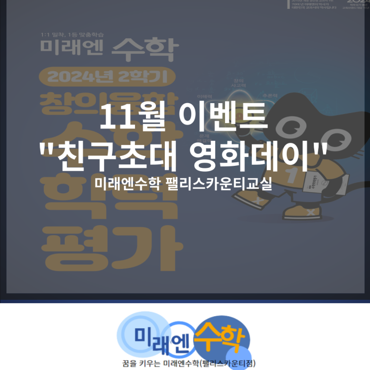 " 미래엔 수학, 아이들과 함께 웃는 시간도 배움입니다" 요즘 독감에 걸린 친구들이 많습니다 날씨도 쌀쌀하고 아픈 친구들이 많아졌어요 미래엔 수학 팰리스카운티 교실에서 아이들과 잠시 공부에서 벗어나 함께 영화를 감상하고 즐겁게 노래도 불러보는 시간을 가졌습니다. 가벼운 간식과 함께 편안하게 영화를 즐기는 모습이 정말 보기 좋았습니다 "원장님 간식 안 가져왔어요" "괜찮아요" "와 "간식까지 준비해 주시다니 "원장님 음치예요" "원장님 몸치예요" 미리엔 친구들이 서로 눈을 마주치고 웃고 즐기는 장면 하나하나 에 집중하는 모습은 학습뿐만 아니라 정서....... <img src="https://blogthumb.pstatic.net/MjAyNTExMjJfMjYz/MDAxNzYzNzc3NTMzMjE1.nOTknVn_n9i3DIM75DCeVKAYzYJqnfa2yIdZEkEXAREg.MXGTIQxfZRBVifh9r-pClJYrdZs1kTOwm_t1d5v2cEwg.PNG/%BB%E7%BA%BB_-%BA%ED%B7%CE%B1%D7-%C1%A6%B8%F1-002.png?type=s3" />