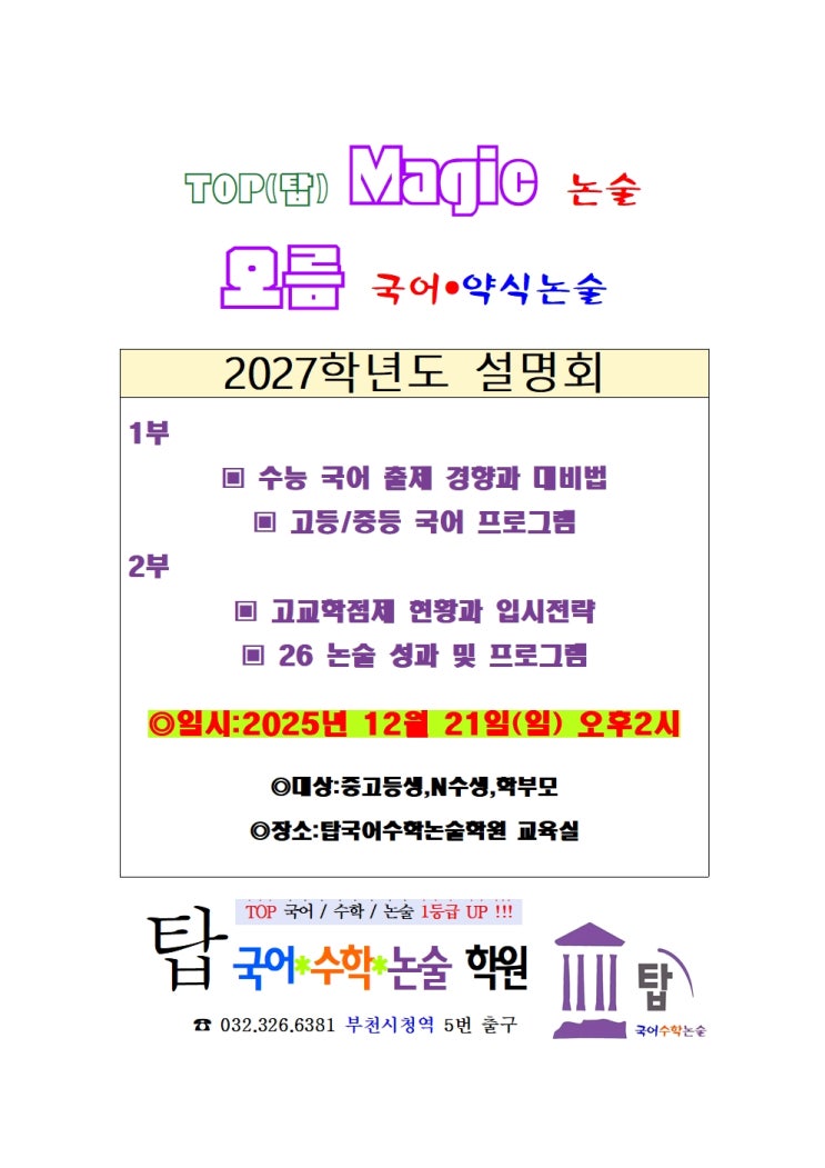 2027학년도 대입 전략 및 논술•국어 설명회 안녕하세요!^^ 탑국어수학논술학원 임승철 원장입니다. 2026학년도 수능과 논술 시험이 끝났습니다. 올해와 지난 몇 년 간 입시 경향을 분석하여 - 입시• 논술(언어/수리/약식 논술) 전략과 입시 성과 및 프로그램, - 수능 국어 대비법 및 중•고등 내신 대비 프로그램 을 알려드리기 위해 입시 설명회를 개최하오니 많은 참여 부탁드립니다! <img src="https://blogthumb.pstatic.net/MjAyNTEyMDFfNzkg/MDAxNzY0NTgwMzc4Nzcw.N2597WbYJYT6d4tWsr28eE7Tev5Arf0gzN1aI6-4rSYg.viRMwcTxVhVG6lhIUDg46senN8A39YS6yOOcdYM7LiYg.JPEG/%C0%D4%BD%C3%BC%B3%B8%ED%C8%B8_%B4%EB%C0%DA%BA%B8%282027%C7%D0%B3%E2%B5%B5%29001.jpg?type=s3" />
