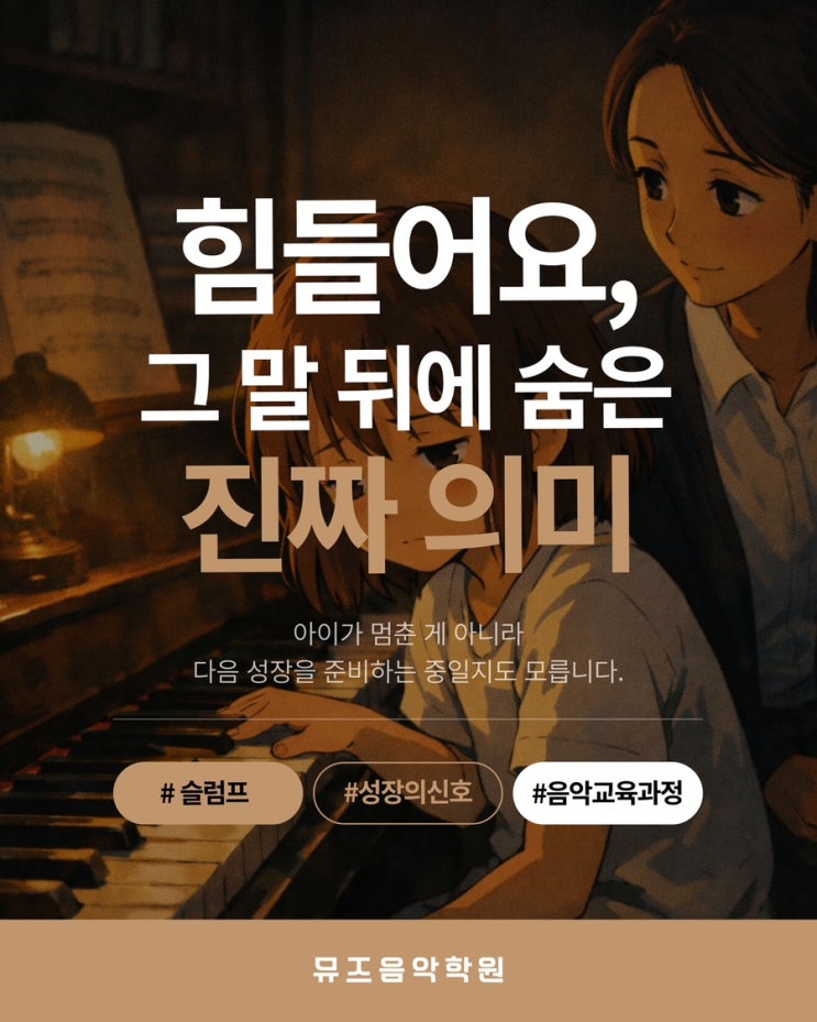 아이가 피아노 앞에서 쉽게 손을 떼지 못하고 "하기 싫어요"라는 말을 꺼낼 때, 부모의 마음은 자연스럽게 불안해집니다. '흥미를 잃은 건 아닐까?' '이제 그만둬야 하는 걸까?' 하지만 음악 교육에서의 슬럼프는 실패나 후퇴가 아니라 성장의 방향이 바뀌는 지점인 경우가 많습니다. ✔️ 아이의 귀는 손보다 먼저 자랍니다. 연주가 어설퍼 보이는 시기에도 아이는 이전보다 더 많이 듣고, 더 섬세하게 느끼고 있습니다. 이때 아이는 '못한다'가 아니라 '이전과 다르다'를 느끼고 있는 중입니다. 그래서 자연스럽게 멈추고, 흔들립니다. 이 시기에 가장 중요한 것은 연습량을 늘리는 것이 아....... <img src="https://blogthumb.pstatic.net/MjAyNjAxMjFfMTI5/MDAxNzY4OTg0NjI2MjUw.LzGpwPagYNthgZouTS_LPstwNLivr-BOhh4E8-3uO-Eg.c2YYh8Tf4Lba-ineX0T3XcxZpu4uM1Sw36RILEnEdSwg.JPEG/IMG%A3%DF4470.JPG?type=s3" />