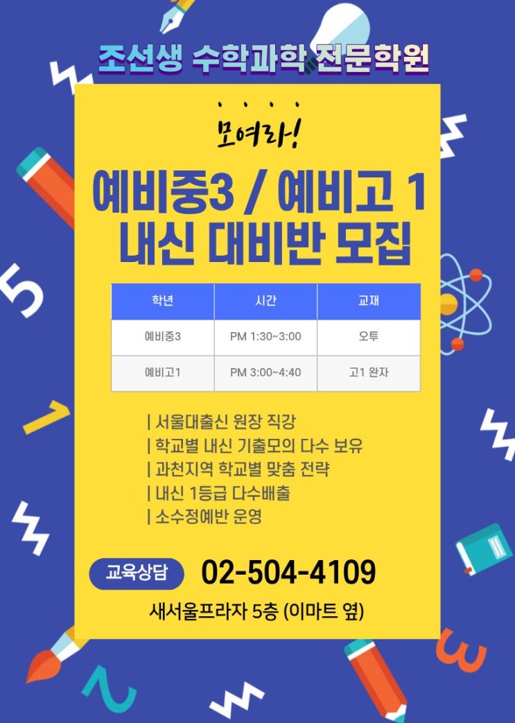예비중3 · 예비고1 모집 안내 조선생 수학·과학 학원 중등에서 고등으로 넘어가는 이 시기, 내신과 실력을 동시에 잡는 수업이 무엇보다 중요합니다. 조선생 수학·과학 학원에서는 예비중3, 예비고1 학생들을 대상으로 체계적이고 전략적인 수업을 진행합니다. ✅ 조선생 수학·과학 학원만의 강의 특징 서울대 출신 원장 직강 오랜 강의 경험을 바탕으로 개념부터 심화까지 흔들림 없이 지도합니다. 학교별 내신 기출·모의문항 다수 보유 과천 지역 학교들의 내신 출제 경향을 철저히 분석하여 실제 시험에 강한 문제 중심으로 수업합니다. 과천지역 학교별 맞춤 내신 전략 학교마다 다른 시험 스타일에 맞춰 학생 개개인에....... <img src="https://blogthumb.pstatic.net/MjAyNjAxMjRfMjMx/MDAxNzY5MjI0ODY4MTc4.B897gNoUIFeYBQXgdiJKPFQq_12AYVHE__SZyFdZnwcg.yTzXNlT5sqCNLS--bf5DRPiZh1pWzydxVh79V6TAUwgg.JPEG/%C1%A6%B8%F1%C0%BB_%C0%D4%B7%C2%C7%D8%C1%D6%BC%BC%BF%E4._%289%29.jpg?type=s3" />