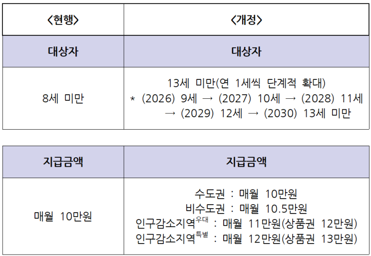 매월 10만원 아동수당, 8세 미만 → 13세까지 확대하고 금액 올린다 아동수당 지급 연령이 2030년까지 13세 미만으로 확대됩니다. 거주 지역에 따라 최대 월 13만원까지 받을 수 있고, 2026년 1월분부터 소급 지급됩니다. 2026 아동수당 인상 핵심 내용 정리했습니다. 만 8세 미만 아동을 키우고 계신가요? 아니면 초등학생 자녀가 있으신가요? 이번 글의 직접 대상일 수 있습니다. 무슨 얘기냐고요? 아동수당 관련 법률이 일부 개정되거든요. 현재 아동수당은 0세부터 만 8세 미만 아동에게 매월 10만원을 지급하고 있는데요. 지급 연령은 확대되고 금액도 오릅니다. 아동수당 대상과 금액을 확대하는 ‘아동수당법 일부개정법률안’이 국회 본....... <img src="https://blogthumb.pstatic.net/MjAyNjAzMDJfMjky/MDAxNzcyNDM3MDE3NTM0.NVOUa-z3Vqvj4nmDGkM6dFQncnOK8JF6CpmNiqHmmYcg.lXVkTs89hg1rlvqXHA_FfDojwWJBFfsXVtUA0IdqGlYg.PNG/%BE%C6%B5%BF%BC%F6%B4%E7_%B0%B3%C1%A4%BE%C8.png?type=s3" />
