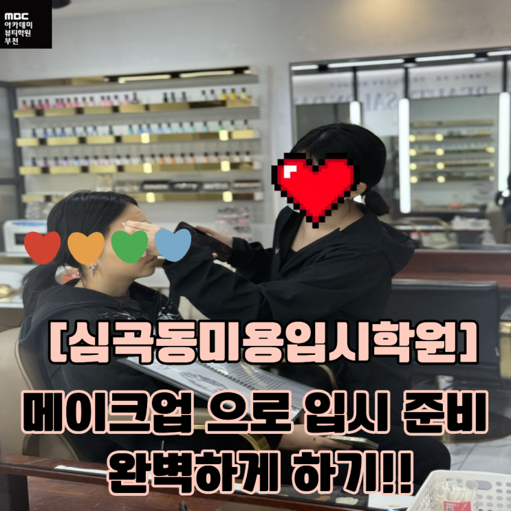 어려분 안녕하세요! 전뷰시 입니다아~!! 오늘은 추적추적 비가 오네요.. 저는 비를 싫어하는데... ㅇ려분은 어떠신가여...?! 오늘은 메이크업 입시에 대해서 알아보려고 하는데요~! 같이 보시죵!! 미용 대학 진학을 꿈꾸는 수험생이라면 체계적인 준비가 무엇보다 중요합니다. 특히 실기 비중이 높은 메이크업 전공은 기본기부터 트렌드 이해, 작품 완성도까지 꼼꼼하게 준비해야 원하는 결과를 얻을 수 있습니다. 오늘은 심곡동미용입시학원에서 메이크업으로 입시를 완벽하게 준비하는 방법에 대해 자세히 소개해드리겠습니다. 왜 심곡동미용입시학원을 선택 해야할까?! 입시 미용은 단순한 취미 수업과는 전혀 다릅니다. 평가 기준에 맞춘 전....... <img src="https://blogthumb.pstatic.net/MjAyNjAzMDJfNTcg/MDAxNzcyNDQxMTQ5MTk4.EUe8jwrExuMcXyYKUgVzZvIsIDFHTCd2Ff-9L9p_S40g.aOq6C_rARWfxmPYarjgXhx6uC6MVJF910U3Nk0YcgEMg.PNG/%C1%A6%B8%F1%C0%BB_%C0%D4%B7%C2%C7%D8%C1%D6%BC%BC%BF%E4._-_2026-03-02T174441.541.png?type=s3" />