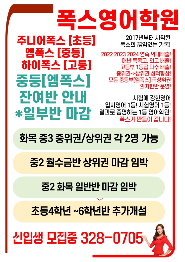 부천 최고의 입시영어학원 폭스영어학원입니다. 3월 마감 임박반 안내 드립니다. 마감임박은 1자리 남은 경우 개시하고 있습니다. 감사합니다!! 목동에 라이딩하지 않아도 목동커리큘럼 그대로! 초-중등 입시영어 준비는 폭스영어학원입니다!!! 요즘 초6-중1 문의가 폭발적으로 늘어나고 있습니다! 더 열심히 지도하고 관리하겠습니다. 감사합니다! 상담문의 032-328-0705 폭스영어학원 <img src="https://blogthumb.pstatic.net/MjAyNjAzMTJfMjA2/MDAxNzczMjg1MDA4ODAz.exkMNuuj-t7-UhcIa3v9mrdpP-yMxe2I0SQbD-CaQIwg.PyU86zS1QYSBsDMp-daTpxHMJ7S7uGCyyhNB343WmjUg.JPEG/%C1%A6%B8%F1%C0%BB-%C0%D4%B7%C2%C7%D8%C1%D6%BC%BC%BF%E4_-001_%281%29.jpg?type=s3" />
