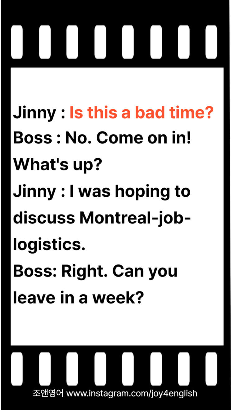 Feb 27,2026 Situation 2 <Korean> Jinny : 시간 괜찮으세요? Boss : 괜찮아. 들어와. 무슨일이야? Jinny: 몬트리올 일에 관해서 얘기를 나누고 싶어서요. Boss: 그래, 일주일 후에 갈 수 있겠어? <English> Jinny : Is this a bad time? Boss: No. Come on in! What's up? Jinny: I was hoping to discuss Montreal-job-logistics. Boss: Right. Can you leave in a week? <설명> 1. I was hoping 은 대체로 공손하고 부드럽게 부탁, 제안, 기대를 할 때 쓰여요. 상대방에게 부담을 덜 주는 느낌이죠. 과거 진행형을 써서, 좀 더 조심스러운 어조예요.. 2. logistics 가 '물류' 정도의 뜻으로만 알고 계 셨다....... <img src="https://blogthumb.pstatic.net/MjAyNjAyMjdfMjM0/MDAxNzcyMTM3NTY5MTc1.QJDSu5xdmi1piZc62Ay82qTO-YKib8E42qx8Z-__zSIg.-nHlnD9ntQBT8kEvqN361uoLg3hR-QWYtmbUvuwgW28g.PNG/IMG%A3%DF7244.PNG?type=s3" />