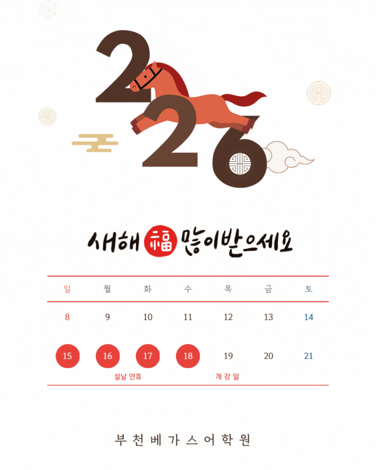 안녕하세요 . 부천 송내동에서 학생 개개인의 학습 로드맵을 설계하는 부천베가스어학원입니다. 저희 학원 아이들이 이번 겨울 방학을 통해 열심히 학습하며 흘린 땀방울은 다가올 새 학기, 누구보다 단단한 자신감의 밑거름이 될 것이라 확신합니다. 저희는 이번 설 연휴동안 아이들이 정서적 에너지를 채우고, 다시 학습에 완벽히 몰입할 수 있도록 아래와 같이 휴원을 실시합니다. 저희 베가스어학원도 이 기간동안 교재 연구 및 수업 설계를 정비하여 더 안정적이고 밀도 높은 수업으로 준비하겠습니다. 가족과 함께 따뜻하고 풍요로운 설 명절 보내시길 바랍니다. 새해 복 많이 받으세요. 감사합니다. 2026년 구정 연휴 일정 안내 1) 휴원 기....... <img src="https://blogthumb.pstatic.net/MjAyNjAyMTNfNDMg/MDAxNzcwOTc4MTA0MzMy.l9dUNBdthioFoHVz2tffnBvNm-xnT-krO3Evhb6yXlsg.xblFoUIpq0Pw0TCkxbOXsuBI19GCDxuZXznzcQip9wcg.GIF/%B0%B3%B0%A1%C0%CF_%283%29.gif?type=s3" />