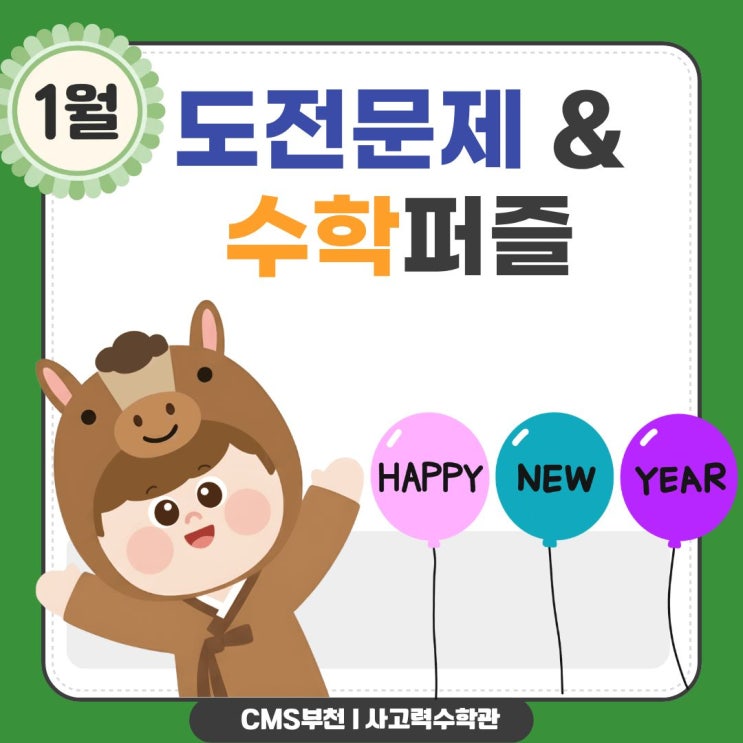 안녕하세요 CMS 사고력수학관 부천지점입니다. 새롭게 시작하는 1월, 도전하는 마음으로 한 해를 힘차게 출발해보아요! 1월 도전문제 및 수학퍼즐 문제지를 공유드립니다. 스스로 생각하고 끝까지 해결해보는 과정이 아이들의 사고력을 한층 더 성장시켜 줄 거예요. 도전문제 우수자에게는 상장 ️도 수여하오니 많은 관심과 적극적인 도전 부탁드립니다. 2026년, CMS와 함께 즐겁게 도전하며 성장하는 한 해가 되길 바랍니다 학원등록 번호 : 5532호 교습비 안내 <img src="https://blogthumb.pstatic.net/MjAyNjAxMDZfMjk5/MDAxNzY3Njk0Nzk1ODgz.F16xUmQol-SDyz9vrdI5UJnye7aHWuddYTpIFY4LUgEg.D_kOqAd9Xz7GWplGbemJv3rj4M1IgNGlVAvH30Oxtrgg.JPEG/%B5%B5%C0%FC%B9%AE%C1%A6%BC%F6%C7%D0%C6%DB%C1%F1.jpg?type=s3" />