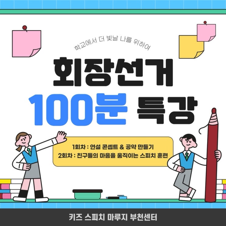 안녕하세요. 키즈 스피치 마루지 부천센터입니다. 다가오는 1학기 학급회장·전교회장 선거, 우리 아이에게는 어떤 기회일까요? 회장선거 도전은 단순히 “당선”이 아니라 자신감 · 표현력 · 리더십 · 설득력을 키울 수 있는 아주 중요한 성장 경험입니다. 마루지 부천센터는 개원 2주년을 맞아, 아이의 성향과 기질에 맞춰 ‘신뢰감 있는 연설문 + 설득력 있는 스피치’를 완성하는 100분 집중 특강을 준비했습니다. 부천 스피치 마루지 2주년 기념 회장선거 100분 특강 OPEN! 연설 원고 작성 + 실전 스피치 훈련을 한 번에! 100분 특강은 “우리 아이에게 맞는 회장 후보 이미지”를 만들고, 친구들의 마음을 움직이는 말하기를 완성하는 프로....... <img src="https://blogthumb.pstatic.net/MjAyNjAxMTNfMjE3/MDAxNzY4Mjk3NDU1MDEy.555Yya_1i9hT2bYSwfqeYncZu13GsEA_15OROTCRIZog.HsflfBiXF-Wv4snoBmxDtqbE2_wRgGbhMGGIYfMAmrUg.JPEG/IMG%A3%DF4973.JPG?type=s3" />