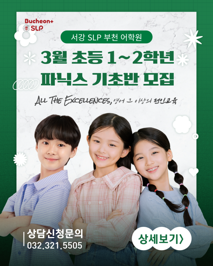 All the Excellence, 영어 그 이상의 전인교육 아이의 첫 영어는 부천SLP에서 시작하세요. SLP는 아이가 영어를 통해 생각하고, 표현하고, 성장하는 힘을 기르는 것을 교육의 핵심 가치로 삼고 있습니다. 영어를 넘어 아이의 성장을 키우는 교육 SLP는 언어 교육이 곧 사고력과 태도의 교육이라고 믿습니다. 영어는 목표가 아니라 도구이며, 그 도구를 통해 아이들은 세상을 이해하고 자신의 생각을 표현하는 법을 배워갑니다. 특히 초등 저학년 시기는 학습의 ‘속도’보다 방향과 기초가 중요한 시기입니다. 이 시기에 형성된 학습 태도와 언어 감각은 이후 모든 영어 학습의 토대가 됩니다. SLP 파닉스 기초반은 이러한 교육철학을 바탕으로, ....... <img src="https://blogthumb.pstatic.net/MjAyNTEyMTZfNTQg/MDAxNzY1ODYxNTg0NzU2.tWWxDvavPyA4_XEyeTdwSBV1NEUwD5CsgAUDHoPEe0Ag.m9dSBSRggiPobsKiDPqENSanvF96szeHjOifPBG6eWAg.PNG/1.png?type=s3" />