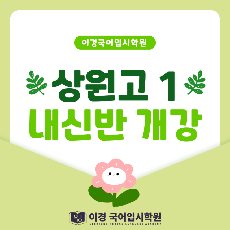 이경국어입시학원 개강 안내 안녕하세요 :) 국어 실력의 기본부터 실전까지 책임지는 이경국어입시학원입니다. 다가오는 학기를 맞아 국어 실력을 끌어올릴 상원고 1학년, 예비 고등 내신반 개강합니다! 학원 자체 교재 사용 수업은 시중의 일반 교재가 아닌, 오랜 강의 노하우를 바탕으로 직접 제작한 학원 자체 교재로 진행됩니다. 교재는 매주 진도에 맞추어 새로 제작되며, 교재비는 별도로 청구되지 않습니다 :) 출제 경향을 반영한 핵심 내용 정리 불필요한 내용은 줄이고, 중요 개념은 강조! 다양한 유형의 질 좋은 실전 문제로 적중률 상승 수업 구성 안내 ✔ 본 수업 3시간 국어의 핵심 개념 설명부터 지문 분석, 문제 풀이까지 탄탄한....... <img src="https://blogthumb.pstatic.net/MjAyNjAyMDRfMTAw/MDAxNzcwMjA2MzY1Mjg4.fyvfipk4-JY7p68I8LdtD7lHsIY_3KbL-YiDkFluClMg._Ib7NS9HX2k6W2FcRa07NvRDgEov7nq3KAATr2oBJokg.PNG/%C1%A6%B8%F1%C0%BB_%C0%D4%B7%C2%C7%D8%C1%D6%BC%BC%BF%E4._%2892%29.png?type=s3" />
