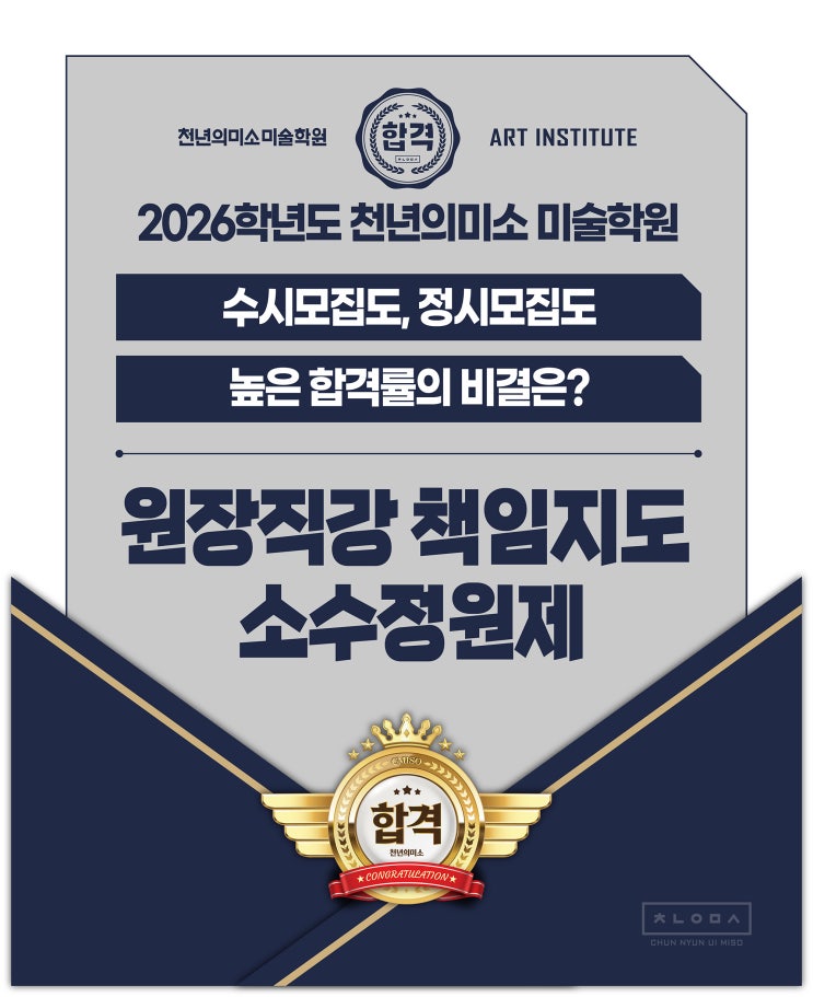수시집중반 전원합격에 이어 정시모집에서도 높은 합격률!! 안녕하세요. 부천상동입시미술학원 천년의미소입니다!! 오늘은 올해 합격자 명단을 정리해 보았습니다. 20명도 안되는 한반에서 대형학원의 인원수에 버금가는 합격자가 나왔습니다!! 모두가 희망을 잃지 않고 힘들어도 함께 노력하며 입시를 마무리 했기에 좋은 결과가 나왔습니다!! 2월부터 시작한 수시집중반 학생 8명이 전원합격에 이어 정시모집에서 대부분의 학생이 합격을 했답니다^^ 실기로 승부 성신여자대학교 디자인과 합격 !! 실기 45%반영 <다군>정시모집 1명지원 1명합격 고3학생으로 최초합격!! 상원고 3 박0주 중앙대학교 시각디자인과 합격!! 실기 40% 반영 정....... <img src="https://blogthumb.pstatic.net/MjAyNjAyMDhfMjc1/MDAxNzcwNTM5MDA1NTgz.6uDk-zmk6HY8HZDExvO-0P777oVdXIHbvSxi1MJUCzQg.tbyqlTClg2JN5qB-Xdl293woHldS-CgXmqgW1RHVmEwg.JPEG/%BA%CE%C3%B5%C0%D4%BD%C3%B9%CC%BC%FA%C7%D0%BF%F8_%BB%F3%B5%BF%B9%CC%BC%FA%C7%D0%BF%F8_%C0%CE%C3%B5%C0%D4%BD%C3%B9%CC%BC%FA%C7%D0%BF%F8_%C3%B5%B3%E2%C0%C7%B9%CC%BC%D2.jpg?type=s3" />