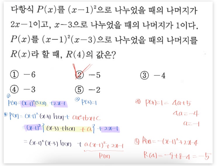부천 목동썬수학입니다~~~~ 오늘은 공통수학1 다항식의 계산에서 출제 빈도가 높은 문제를 풀어보겠습니다. 다항식의 나눗셈을 배우면서 몫과 나머지에 관한 내용 중 잊지 말아야 하는 것!! 바로 이 것! 오늘은 문제를 풀어봅시다~ 첫번째, 이차식으로 나눴으니 1차 이하의 나머지, 두번째, 일차식으로 나눴으니 상수! 특히, ' 나머지 정리' 개념 다시 확인!!! 세번째, 삼차식으로 나눴으니 이차 이하의 다항식으로 표시하는 걸 잊지 맙시다. 그리고 마지막으로 p(X)를 나누는 다항식에 따라 표시한것임을 잊지 말고 주어진 조건에 맞춰 계산하면 됩니다. 수학 문제는 스스로 풀어낼 줄 알아야 합니다. 부천 목동썬수학입니다~! <img src="https://blogthumb.pstatic.net/MjAyNjAyMDlfMzQg/MDAxNzcwNjI2MzU1MjU5.qtnz_0nJEtCXswWvKkJw89eO2pR8iePx7s0jxYE920Yg.KH_mL7_glq36f_FPx_Xmb6AsPZktvPV_axHaA68oylkg.JPEG/%B0%F8%BC%F61-%B4%D9%C7%D7%BD%C4%C0%C7_%B3%AA%B4%B0%BC%C0.jpg?type=s3" />