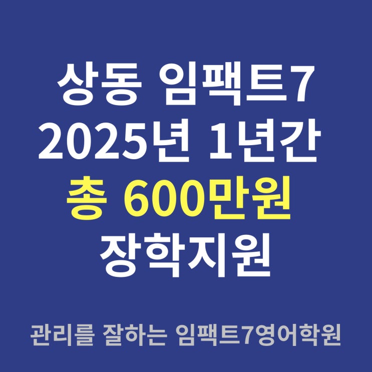 안녕하세요, 부천 상동 관리를 잘하는 임팩트7영어학원입니다! 오늘은 상동 개원 이래 15년간 꾸준히 이어오고 있는 장학사업 소식을 전해드리고자 합니다. 2024년 999만원에 이어서 지난 2025년에는 총 600만원을 재원생 장학금과 저소득층 자녀 수업지원으로 지급하였습니다. 2026년 올 한해에도 많은 학생들에게 혜택을 제공하고 지역사회 발전에 책임을 다하는 교육기관이 되겠습니다. 모든 학생들의 가정에 늘 건강과 따뜻함이 함께하시길 바랍니다. 감사합니다! <img src="https://blogthumb.pstatic.net/MjAyNjAyMDlfOTAg/MDAxNzcwNjIyNDA5MDY2.UQhOZyIlDtVyce1R82VjnbtWGpJufF0ppCXwMgI3ZnIg.dN9Cx6eOrwrJS87HjQl57coVibJNkPWvgCoNXIwJVOQg.JPEG/2024-%BD%BA%C5%CD%B5%F0%C7%C3%B7%AF%BD%BA%C0%E5%C7%D0%BB%E7%BE%F7-%C8%AB%BA%B8-001.jpg?type=s3" />