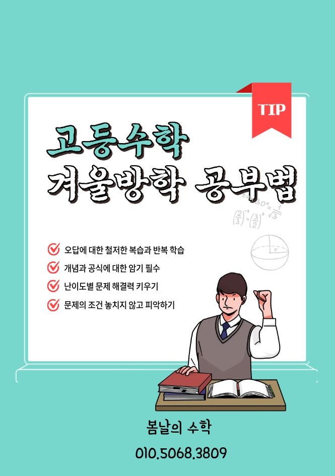 안녕하세요~ 봄날의 수학입니다. 2026년 새해가 시작되고 새 마음을 다잡고 열심히 공부하고 있나요? 봄날의 수학 우리 봄날이들은 장쌤의 계획안에서 본인들의 공부를 열심히하고 있답니다~ 오늘은 고등 수학 공부법에 대해 이야기를 나눠보려합니다. 고등 수학은 개념 이해와 루틴 내신과 모의고사 병행이 핵심이라고 할 수 있어요. 우선 개념 공부를 철저하게 해야합니다. 중등 과정과 연계되는 고등 개념들도 한 번 더 체크하는게 중요합니다. 그 개념을 이용하여 예제를 풀고 오답을 정리하는 루틴을 반복하는 것이 좋겠죠? 그렇다면 내신과 모의고사 병행은 어떻게 하는게 효과적일까요? 사실 내신과 모의고사는 분리되는 것은 아닙니다. 내....... <img src="https://blogthumb.pstatic.net/MjAyNTEyMTdfMjcy/MDAxNzY1OTUwNzk1OTg1.FY8PYfpmqc3LzBnn7Sg-5Odr9g0R3AcjLvXABFy13UYg.Ti5ab116lNHisiUJlq35gcon2HdPgYo6Cj4xtUMD_J8g.JPEG/%C1%A6%B8%F1%C0%BB_%C0%D4%B7%C2%C7%D8%C1%D6%BC%BC%BF%E4._%282%29.jpg?type=s3" />