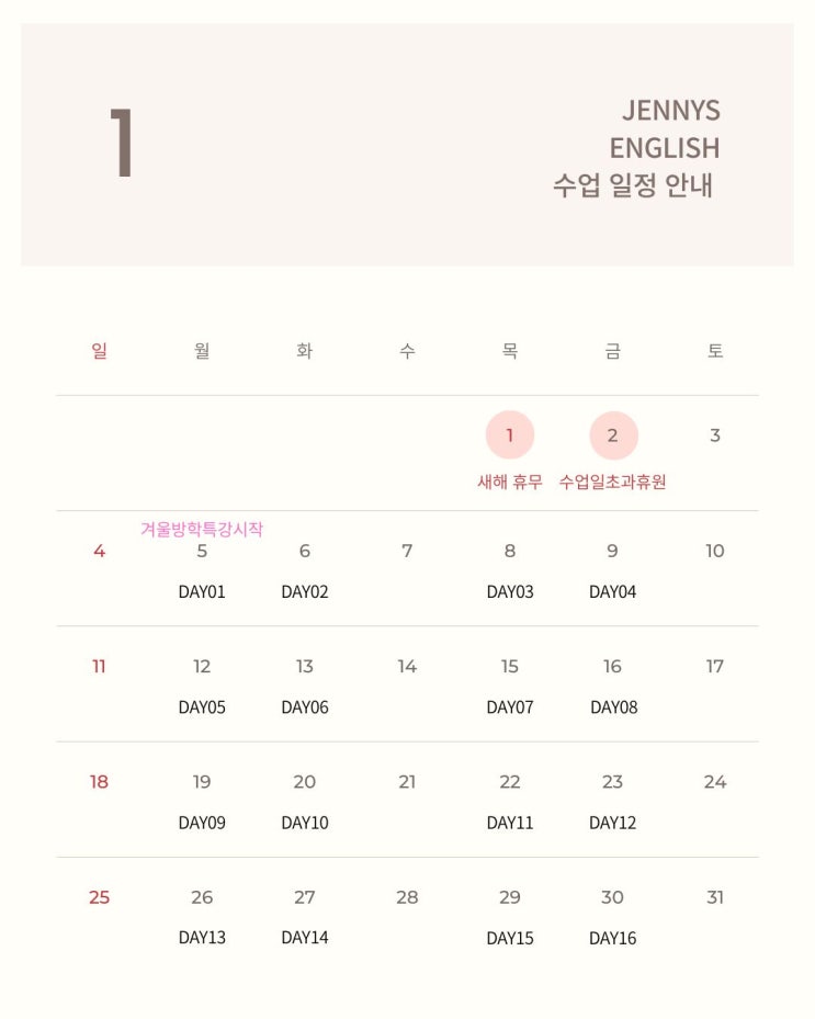 안녕하세요 제니쌤이예요. 1월 , 2월 겨울방학 수업안내 드립니다. *12월 30일부터 1월 2일까지는 학원 방학입니다. (12월 30일 학원 겨울 방학 / 12월 31일 수요일 휴원 / 1월 1일 공휴일/ 1월 2일 1월달 수업일 초과 휴원일 ) 올해의 마지막 좋은 휴식을 가지고 다시 돌아오겠습니다 :) *1월 5일부터 정상 수업 시작및 특강 시작으로 방학 시간표대로 아이들을 시간에 맞춰 등원하도록 안내 부탁드립니다. * 방학중 결석은 기존 수업과 특강 모두 보강합니다. ( 무단 결석시 보강은 어렵습니다 ) * 본래 월화목금 주 4일 수업이지만 , 2월달 수업일수 부족으로 인해 수요일 수업이 두번 (2월 11일, 2월 25일 ) 있습니다. 확인하셔서 아이들이 잊....... <img src="https://blogthumb.pstatic.net/MjAyNTEyMjlfODIg/MDAxNzY3MDEyODMxMjgy._3oRdjtu8nU8MLwNpbsFNkoJvri-0LBdy-RBRRkQNvIg.uHAqgnlDjjST9O1buao6oxzSEE9-KdV-Cl9WJ5Hc3H8g.JPEG/1.jpg?type=s3" />