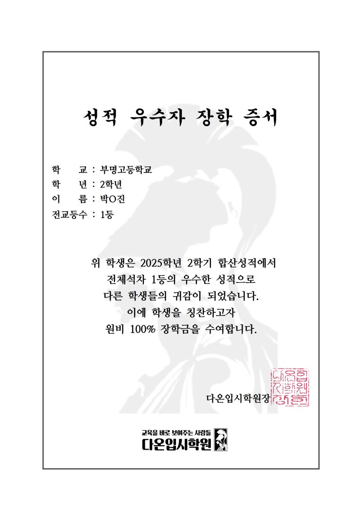 2025년 2학기 기간동안 열심히 공부한 우리 다온인을 위한 [성적우수자 장학증서]입니다. 좋은 성적 뒤에 숨어있는 수고와 인내, 노력을 칭찬합니다. 정말 수고하셨습니다!! <img src="https://blogthumb.pstatic.net/MjAyNjAxMDZfNzUg/MDAxNzY3Njg3OTcxNTUz._W_TIWZbW007Tun21qyHbSNwkMNfj2VaJaECu3OULRUg.NrRal6Xb2fufNtlfRO90AHLBjWS-ja8wc8HHqEMBnkgg.JPEG/%BC%BA%C0%FB%BF%EC%BC%F6%B0%D4%BD%C3%BF%EB001.jpg?type=s3" />
