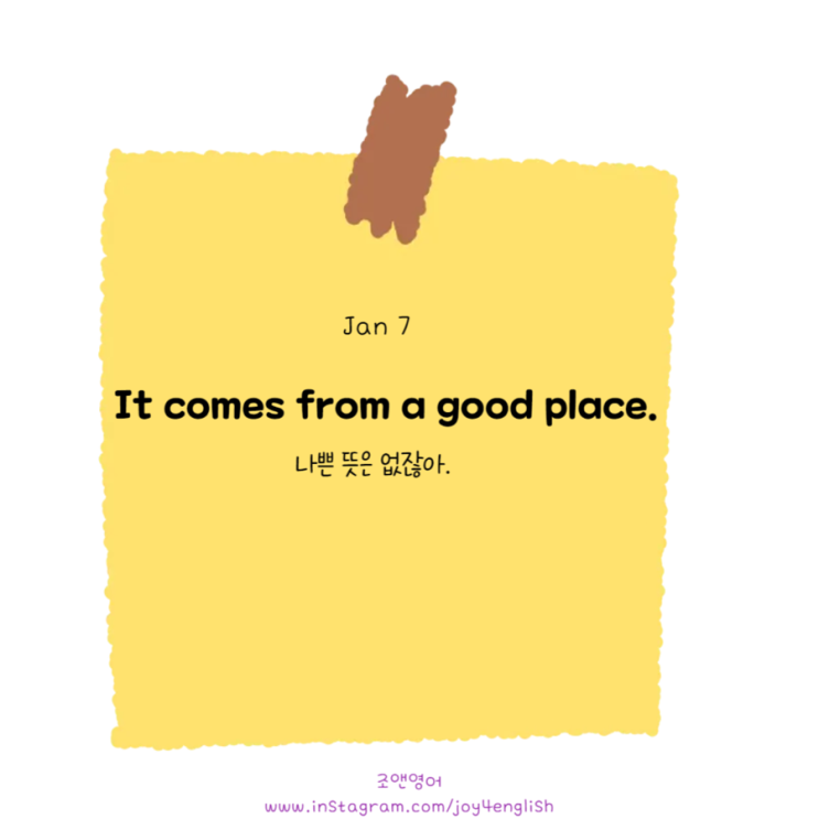 January 7, 2026 ‘나쁜 뜻은 없잖아‘…영어로? <설명> 1. express : 표현하다. 이 대화에서 your dad expresses (너의 아빠가 표현하다)문장이 the way'를 꾸며줘요. 2. misguided : 잘못 인식한, 현명하지 않은, 서 투른 등으로 번역되요. 3. come from a good place : 좋은 의도에서 나오다. 선의였다. 4. bother : 신경쓰이다. 거슬리다. 부정적인 의 미에요. #misguided #express #bother #신경쓰이다 #오해 #나쁜의도 #영어표현모음 #영어공부법 #영어회화표현 <img src="https://blogthumb.pstatic.net/MjAyNjAxMDdfMTcg/MDAxNzY3NzM3NDE2MzE2.C1HqMC91xt7z0JRsGWtp815VFQzq-vMXx5UbuP-pcb8g.wLOhcUrwUPZ_7u5zWQdh5Pdmv6GVAgI-WTCHPm7e_kog.PNG/IMG%A3%DF6789.PNG?type=s3" />