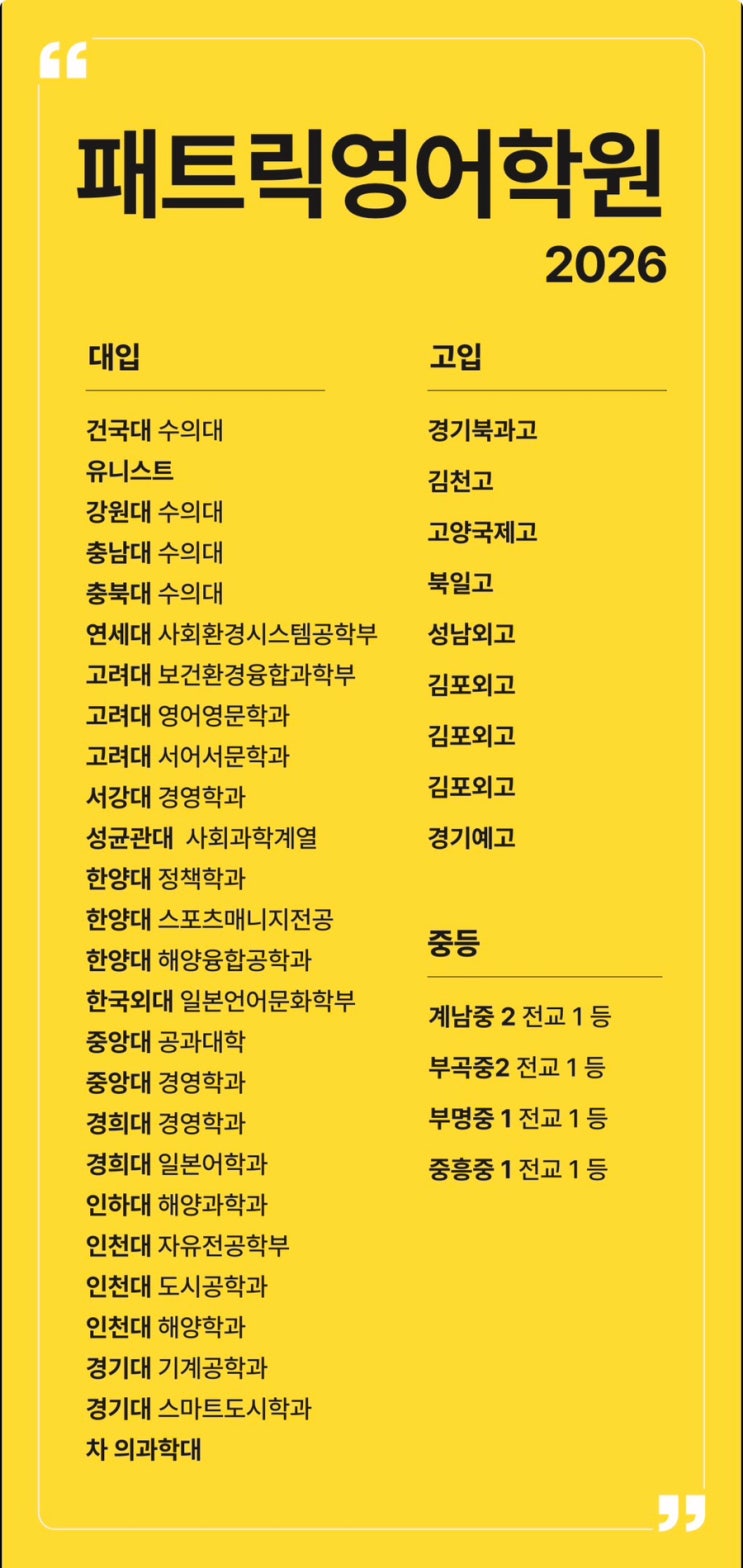 Kelly 원장의 정상어학원 영어, 누가 어떻게 지휘하는냐에 따라 결과가 달라집니다. 안녕하세요, 상동정상어학원입니다. 초·중학교 영어의 기초, 겨울방학 특강을 안내합니다. 겨울방학은 영어 실력을 근본부터 다질 수 있는 가장 중요한 시기입니다. 특히 중등 영어에서 문법은 단기간에 정리하지 않으면 고등 영어까지 계속 발목을 잡게 됩니다. 그래서 준비했습니다. ✔️영어 문법을 체계적으로 정리하는 겨울특강✔️ 왜 겨울특강이 필요할까요? ✔ 중학교 문법은 고등 영어의 70% 이상을 차지 ✔ 학기 중에는 학교 시험·수행평가로 정리할 시간 부족 ✔ 개념 이해 없이 문제만 풀다 보면 문법이 ‘암기 과목’이 됨 이 부분을 보충하....... <img src="https://blogthumb.pstatic.net/MjAyNTEyMjlfMTA2/MDAxNzY2OTk2MzgzNjY4.JDQNIZ32QQyNSit_kGgqiT7rrzYoxVglFLuENxRwiVAg.0aY5v-vyLLTI8KasVMd4gGsPOgc520maoTa-VP6tJN4g.JPEG/2026_1st_Term_%B0%DC%BF%EF%B9%E6%C7%D0%C6%AF%B0%AD%B9%AE%B1%B8001.jpg?type=s3" />