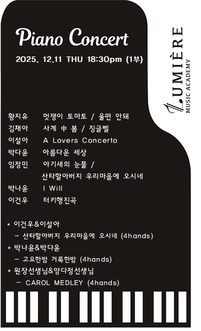 안녕하세요! 12월답게 매서운 추위가 찾아왔네요! 모두들 건강 유의하시고 1년 마무리 잘 하시길 바랍니다~♡ 저희는 이번 크리스마스&연말 연주회를 준비중에 있답니다 ♥ 아이들이 연주하는 캐롤과 연주곡을 학부모님들께 보여드릴 생각하니 벌써 마음이 따뜻해지네요~ : ) 학원에서 캐롤이 울려퍼질때 그 즐거움과 행복함은 뭐라 표현할 수가 없네요 ㅎㅎ! 이번 연주회는 학부모님들을 초대하여 열리는 연주회라 더욱 기대가 큰데요~ 우리 아이들도 설레는 마음을 가지고 아주 열심히 연습해주고 있답니다 ㅎㅎ~ 그리고 특별히 ! 이번 연주회에서는 형제&자매의 4hands 캐롤 & 원장선생님과 다정쌤의 4hands 연주가 있을 예정이랍....... <img src="https://blogthumb.pstatic.net/MjAyNTEyMDRfMTQy/MDAxNzY0ODIzNTg4NTMy.KHec5vpx782O24zLeBLECDd9DrBmEL6r-NAijn4FBJ8g.T05M9XN15g_HcrA1YahYOfpsj1aeCuUEZpEujRAMxtIg.JPEG/%BF%AC%C1%D6%C8%B8_12%BF%F911%C0%CF%28%B8%F1%29.jpg?type=s3" />