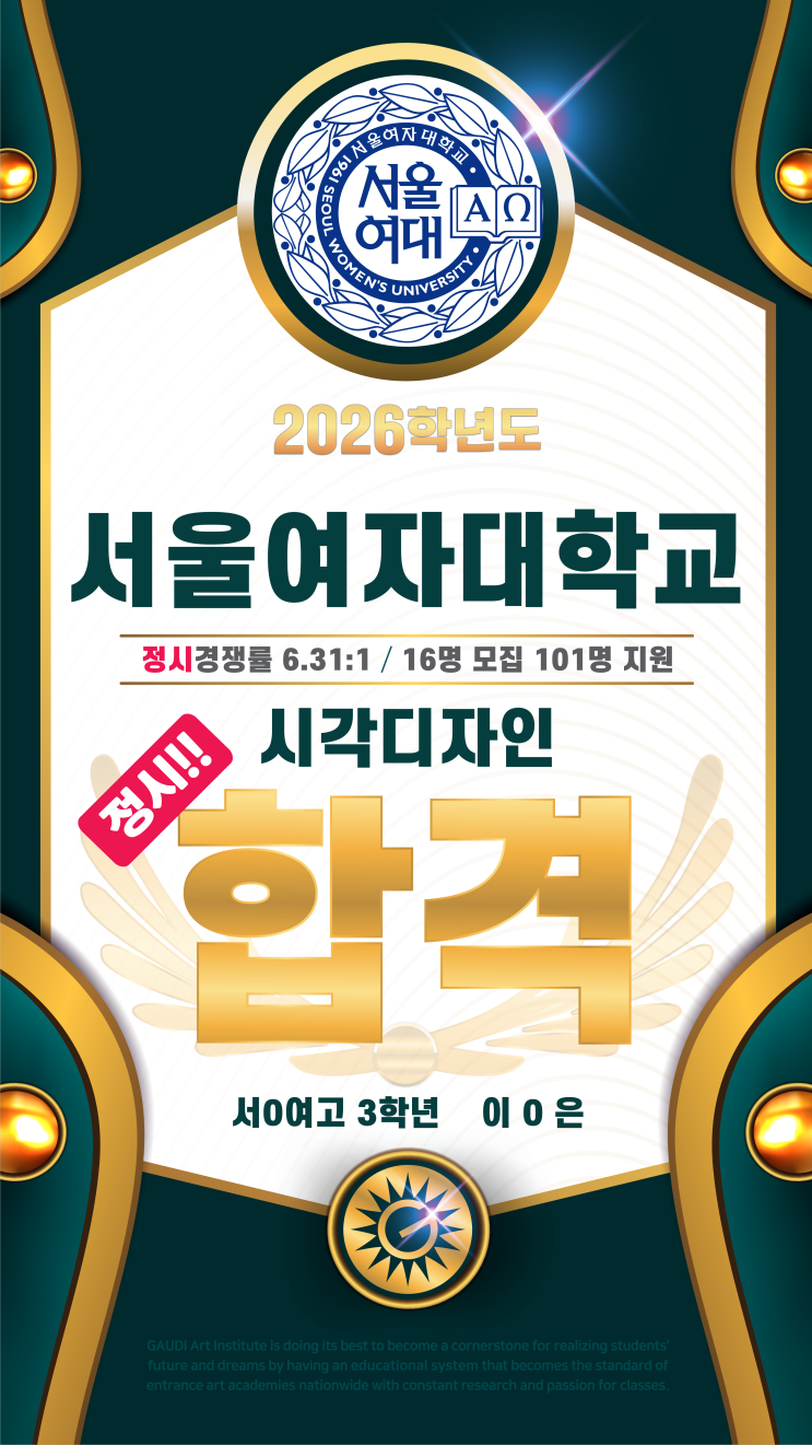 2026년도 서울여대 합격!! 2026년도 서울여대 합격을 축하합니다!!! 광명가우디미술학원의 탄탄한 실기력과 높은 합격률!!! 입시미술전문학원 #광명 #철산 미술학원 광명가우디미술학원!! [상담예약: 02.2060-9746] 2026년도 서울여대 합격을 축하합니다!!! 2025년도에 이어 2026년도 정시.수시합격 대박행진중!! 오직 단 한해!! 정시.수시합격!! 결과로 말합니다!! 올해 최고 경쟁률!!! 86:33: 1 !! 전국 12명 모집!!! 오로지 실기 100%!! 광명 유일!!! 서울여대 수시합격!! 2026년도 서울여대 수시합격!! 2026년도 성신여대 수시합격!! 2026년도 가천대 3년 연속 수시합격!! 2026년도 상명대 수시합격!! 2026년도 호서대 수시....... <img src="https://blogthumb.pstatic.net/MjAyNjAzMDNfMTI4/MDAxNzcyNTE2OTg5NTUz.CaQT3YFhclmvMrd88Asi4P1EUpgvNHcKI64Vi3t6IfUg.or_bGVPf_9CTDpgzJ3waaUaDdCqSxUj3pEDi88o5NwQg.PNG/2026%BC%F6%BD%C3%C7%D5%B0%DD%C0%DA%B8%B1%BD%BA-07_%282%29.png?type=s3" />