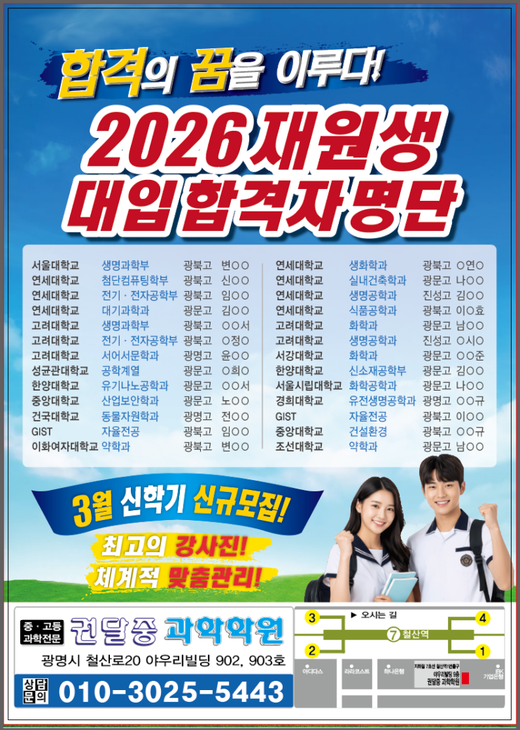 안녕하세요 권달중 과학학원입니다. 26년 대학입시결과 입니다 후회없는 선택 언제나 최선을 다하겠습니다 궁금하신부분은 수,금 4시30분~10시 토 10시~7시30분 일 10시30분~7시30분 상담 가능하며 방문 상담은 미리 예약 부탁드립니다 (아이들 출결시간,다른 학부모님 상담과 겹치게되면 기다리셔야 합니다ㅠ) ☎️010 3025 5443 <img src="https://blogthumb.pstatic.net/MjAyNjAzMDRfOTAg/MDAxNzcyNjE0MDMyODkw.jw51XkxwGRS1290kRDhr_UPS2htWCm8WWX4DEHFgjFUg.6skDBhHIlFOctaiALPz4j_lVkcm6aFIdlHY-bhBoArkg.PNG/IMG%A3%DF2686.PNG?type=s3" />