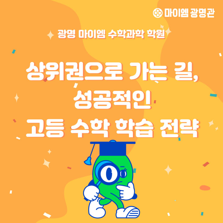 상위권으로 가는 길, 성공적인 고등 수학 학습 전략 :: 광명 마이엠 수학과학학원 안녕하세요 마이엠 광명관입니다:) 고등학교 수학은 많은 학생들이 가장 부담을 느끼는 과목입니다. 학년이 올라갈수록 난이도는 급격히 높아지고, 내신과 수능 모두에서 변별력을 좌우하는 핵심 과목이기 때문입니다. 그러나 수학은 타고난 재능만으로 결정되는 과목이 아닙니다. 올바른 방향 설정과 충분한 몰입, 그리고 꾸준한 습관이 더해진다면 충분히 상위권으로 도약할 수 있습니다. 이번 글에서는 성공적인 고등 수학을 위한 준비 방법과 학습 전략을 체계적으로 정리해보겠습니다. 1. 고등 수학의 출발점은 중등 개념의 완성 고등 수학을 잘하기 위해 가....... <img src="https://blogthumb.pstatic.net/MjAyNjAyMjRfMTcx/MDAxNzcxOTIwODU3Mzc0.EJ8lWJU7gnujjkrBYaytq4XgfG-sb0oOJlG3Zr6mPR8g.WpELNUEfZzJVuXDTxU0FHjNDtX5taBs73k4FA6z-3wkg.PNG/%B8%B6%C0%CC%BF%A5_%C4%AB%B5%E5%B4%BA%BD%BA-01.png?type=s3" />