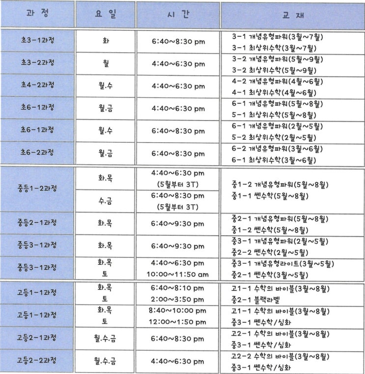 안녕하세요 : ) 언제나 열정적인 하피수학학원입니다! 새 학기의 설렘이 가득한 3월부터 시작되는 <2026년도 1학기 초등부> 시간표를 공개합니다! 본격적인 시작을 알리는 첫 학기, 탄탄대로를 위해 초석을 다지는 시기인 만큼 체계적인 공부 계획이 필요한 때입니다. 저희 하피 역시 이번 2026년에도 아이들이 단계적인 성장을 이룰 수 있도록 심도있는 고민 끝에 교육 과정을 구성하였습니다! 하피의 탄탄한 초등부 교육 과정, 2026년 정규 수업 첫 시작을 소개합니다! 초5 MP 반 * 수업 요일: 월, 수, 금 (주 3일) * PM 15:15~16:00 (1교시): 5-2 과정 (디딤돌/쎈) * PM 16:00~17:30 (2교시): 5-1 과정 (최상위 수학) 초6 MP 반 * 수업....... <img src="https://blogthumb.pstatic.net/MjAyNjAyMjZfMTU5/MDAxNzcyMDkzNjQ2NjAz.kB3jxO9SWkmT6bikwrNalgbftQqzVu2LkN-5AshbTDog.zDj10Mqj3yoJzKlLYi26Ks31P9q0HnfBXpG12-nLJXgg.PNG/image.png?type=s3" />
