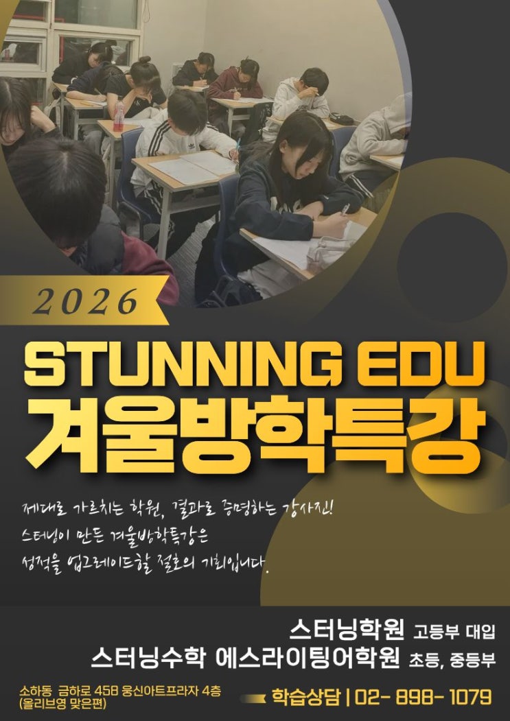 2006 STUNNING EDU 겨울방학특강 제대로 가르치는 학원, 결과로 증명하는 강사진! 스터닝이 만든 겨울방학특강은 성적을 업그레이드할 절호의 기회입니다. <겨울방학특강 안내> 어느덧 한 해의 끝이 다가오며 겨울방학이 가까워지고 있습니다. 매년 방학은 짧지만, 그 안에서 얼마나 알차게 시간을 보내느냐에 따라 다음 학기의 스타트가 달라지곤 하죠. 2026년 겨울방학을 더욱 의미 있게 만들어 줄 특강 프로그램을 준비했습니다. 이번 특강은 핵심 개념 정리부터 실전 문제 적용까지 한 번에 잡을 수 있도록 구성되어 있으며, 학생들이 스스로 성장을 느낄 수 있도록 단계별 커리큘럼으로 진행됩니다. 특히 겨울방학은 학습 공백을 줄이....... <img src="https://blogthumb.pstatic.net/MjAyNTEyMDhfMjQ1/MDAxNzY1MTc4OTk1NzY3.unpIK_8GsfON7DrY5_wKbg1195Lv-VehMiHVy2bF4HUg.K4VPBxYciCe7X0sEq9fnCp2gxsRx0JVGPlwOYxWx-k0g.JPEG/1.jpg?type=s3" />