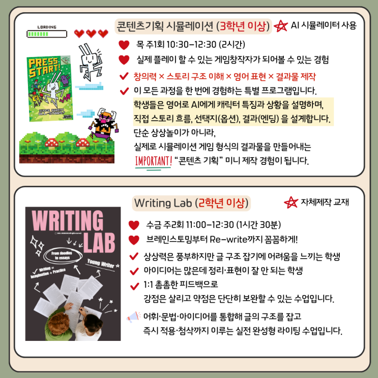 겨울방학 특강 모집을 시작합니다 정원 : 반 별 최대 6명 교재제작으로 인해 입금 순으로 등록완료됩니다. * 예정된 여행으로 인한 결석도 보강으로 진행됩니다 * 특강 시작 전 환불 가능합니다. 항상 강조드리듯 이번 특강 또한 부족한 부분을 채워나가는 학습을 추천드립니다. 아이의 영어학습경험, 학습중인 교재, 학습시 어려워하는 부분 말씀주시면 필요한 반으로 상담드립니다 ☺️ ✔️ 체크리스트 "문법을 오래했는데도 어려워해요" "해석이 정확하지 않아요" "문법을 제대로 이해했는지 모르겠어요" 용어정리와 문장구조 이해부터 시작해주세요 > 서술형 첫걸음 "글을 읽고도 이해를 못....... <img src="https://blogthumb.pstatic.net/MjAyNTEyMTBfMTgy/MDAxNzY1MzM2MTAxNTQw.XOo_h1GHdJVSdqsvLaM_wept_RumYc-9vSAyBfzDPeEg.NNjf-ukDRaBwnYfo4TIUCGnoPLigiwcFRLGoUwnRaSgg.PNG/%B0%DC%BF%EF%C6%AF%B0%AD_%BF%B9%C1%F8.png?type=s3" />