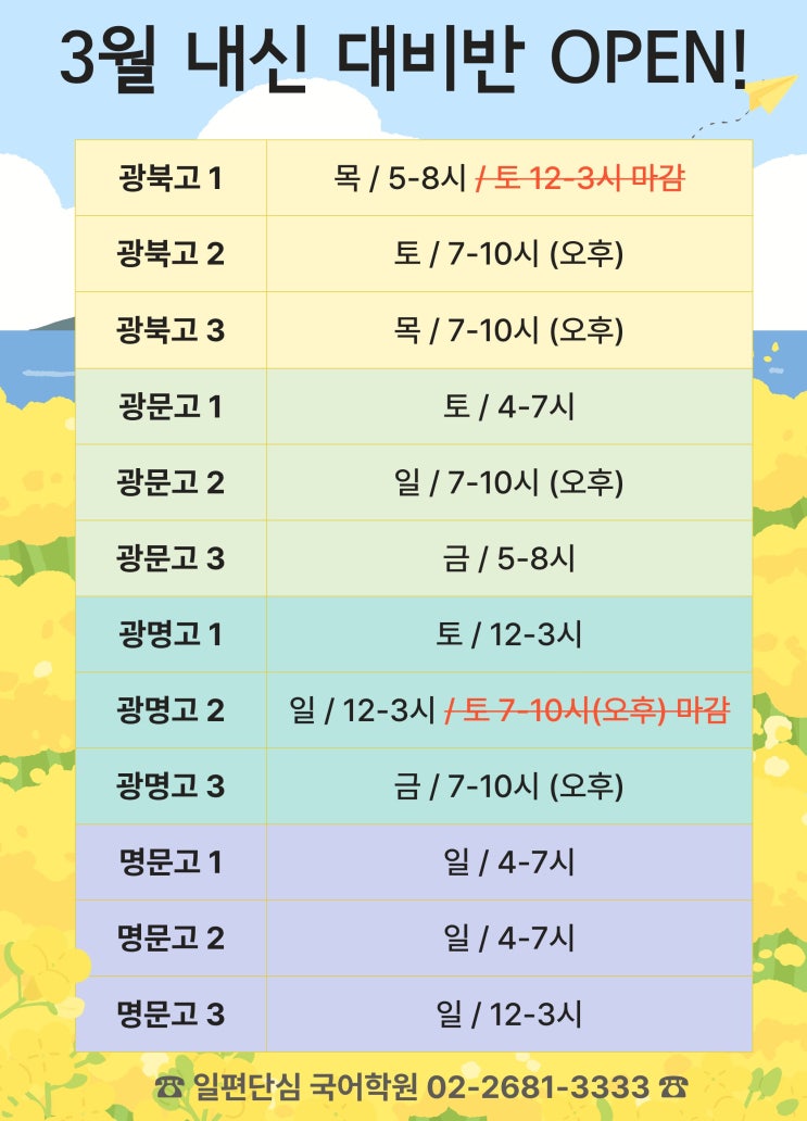 [일편단심국어] ★3월 학교별 국어 내신반 개강안내(고등부)★
