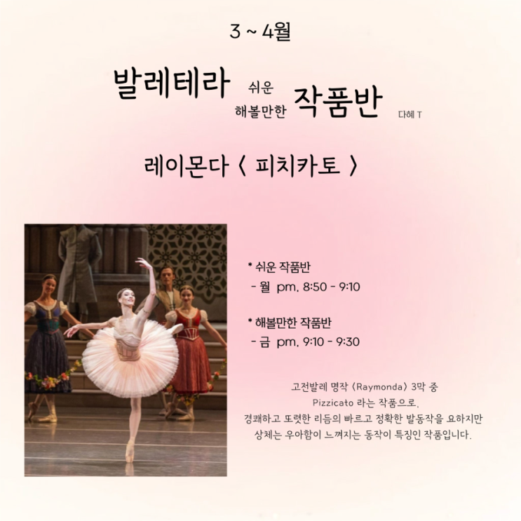 - 발레테라 3-4월 < 쉬운&해볼만한 작품반 > 발레테라의 싱그러운 봄맞이 작품은 고전발레 명작 중, *Raymonda* 라는 작품의 3막에 나오는 - Pizzicato - 라는 작품으로 매우 경쾌하고 귀엽지만 또렷한 리듬 안에 빠르고 정확한 발동작과 절제된 우아함을 머금은 상체동작이 특징인 작품이에요 :) 각 작품반마다 레벨에 맞추어 박자, 동작을 만들어 나가므로 처음 발레를 입문하시는 분도, 기본기를 잡을 겸 발레다운 발레를 하고자 하시는 분도 모두 어렵지않게 도전해보실 수 있는 작품반이랍니다☺️ . . 발레테라의 모든 수업은 초보자 분들도 쉽게 입문하실 수 있는 레벨로 진행되고 있으니 많은 문의 부탁드려요 ♦️문....... <img src="https://blogthumb.pstatic.net/MjAyNjAzMDlfNSAg/MDAxNzczMDYyMzQ5NzAw.LxhP2X606CJ71V7jvuwjNBf1H_42iqFg0vdU485ODB4g.HCLeSS94Tfw4Z159m0zXt6EjYpyiM-L56xD4qHaKQbUg.PNG/3%A3%DF4%BF%F9%A3%AD%C0%DB%C7%B0%B9%DD%A3%AD%C7%C7%C4%A1%C4%AB%C5%E4%A3%AD001.png?type=s3" />