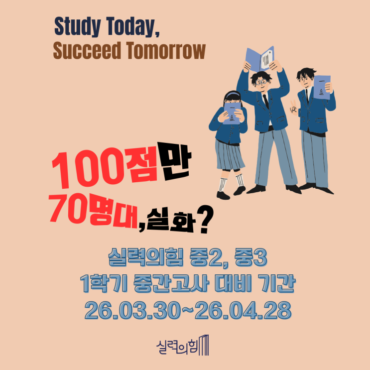 실력의힘 중간고사 대비 기간 안내 중2·중3의 첫 내신 시험, 1학기 중간고사대비가 곧 시작 됩니다. 실힘은 광명에서 까다롭기로 소문난 철산중, 하안북중의 영어 시험에서 “100점만 70명대” 의 결과를 만들었습니다. 100점만 70명대면, 90점대는 얼마나 많을까요? (너무너무 대견한 우리실힘둥이들 ♡) 이번 중간고사에서도 우리 아이들의 노력이 결과로 증명되는 26년 첫 시험 만들어보겠습니다. 중간고사 대비 기간 2026년 3월 30일 ~ 4월 28일 실힘의 내신은 9단계의 test로 이해도와 암기도 측정 + 담임샘과 진행하는 1:1 오답 점검까지 911 내신을 진행하고 있습니다. 이에 내신 2주차부터 기존 재원생들의 안정적인 학습을 위해 신....... <img src="https://blogthumb.pstatic.net/MjAyNjAzMTlfNzcg/MDAxNzczODc5ODQ3MDM2.gYU6_ophnoO9IoSdsagNZbLbn_MLdhUh1OwfXkTMJx4g.Wl3zmbL7cKZCIUyqUo8hwpEpxUlAy3lzkE_-3999-IIg.PNG/%BD%C7%B7%C2%C0%C7%C8%FB_1%C7%D0%B1%E2_%C1%DF%B0%A3%B0%ED%BB%E7_%B4%EB%BA%F1_%B1%E2%B0%A3_26.03.3026.04.28.png?type=s3" />