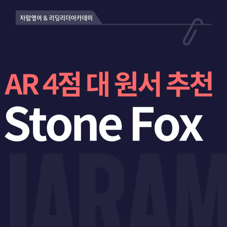 안녕하세요. Beyond the Limit Circulation & Integration Fruit of Growth 아이들의 무한한 가능성을 생각하고 언어 학습을 유기적으로 연결 통합하며, 동기부여 하는 교육을 지향하는 일직동 광명역 앞에 위치한 초중고 영어 전문 어학원 '자람영어 & 리딩리더아카데미' 입니다. 미국의 역사적 배경을 알 수 있는 짧지만 감동적인 이야기! 모험 이야기, 감동적인 서사, 뚜렷한 주제가 있는 책을 좋아하는 아이들에게 추천하고 싶은 책! 오늘 빅원장의 원서추천 시간에서는 <Stone Fox> 도서를 소개 하겠습니다. 짧은 문장과 명확한 스토리 구조, 그리고 감정선이 분명한 전개이기 때문에 초등 고학년 아이들이 읽으면....... <img src="https://blogthumb.pstatic.net/MjAyNTEyMDNfMjY5/MDAxNzY0NzQ3MDY2NDkx.68W9VEh69iS0AGkeH-_aI5MTKlDQexbNe6NtQNQuaqEg.tQmWcRQaRakLQXiYuDFSRyi-zeXUzUgdrQdsS92zEqYg.PNG/001.png?type=s3" />