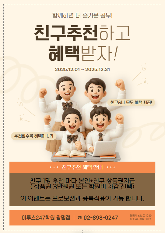안녕하세요 이투스247학원 광명점입니다. 12월 이벤트 공지 입니다. 12월 동안 소개시 본인+친구 상품권 지급 이벤트 입니다. 본 이벤트는 12월 17일까지 진행되는 프로모션과 중복 됩니다^^ <img src="https://blogthumb.pstatic.net/MjAyNTEyMDFfMTUx/MDAxNzY0NTc5Mzc5Nzc5.zgh3P8YdOtZfOAXdu2dnPpKh8sM7wYcXPXgtBitv3Ysg.b5DEW-OXI1E4op2F2AI6-Lu1tm42rU3e2H2VgfSxCjUg.PNG/%C4%A3%B1%B8%BC%D2%B0%B3%C0%CC%BA%A5%C6%AE.png?type=s3" />