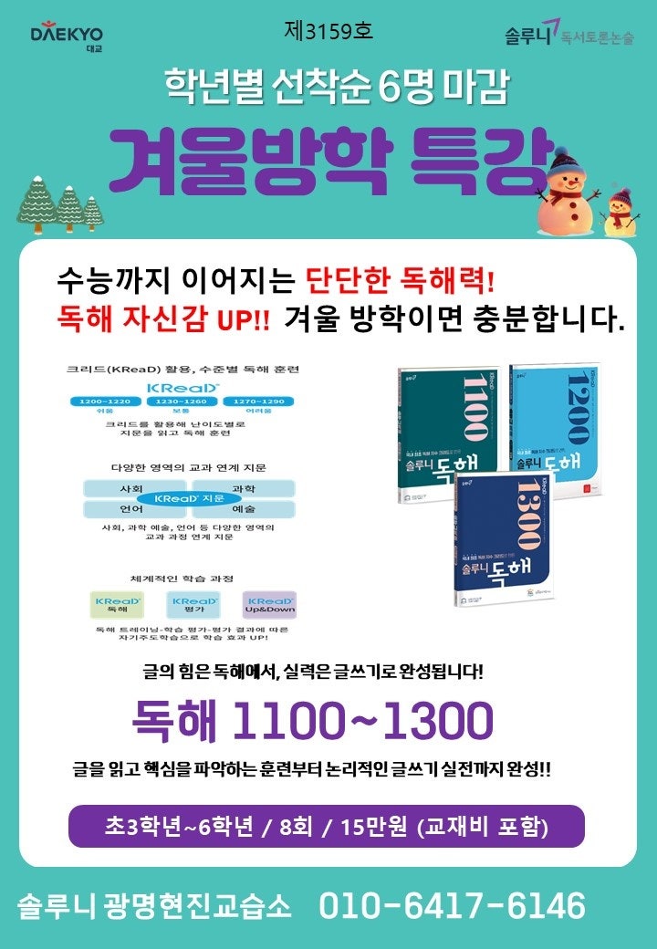 겨울방학 특강 선착순 모집합니다. 글을 읽어도 핵심 파악 못하는 아이~ 책 읽기 어려워하는 아이~ 글쓰기 어려워하는 하는 아이~ 대상: 초등 3학년~6학년까지 초등 3.4학년은 독해 1100 초등 5학년은 독해 1200 초등 6학년은 독해 1300 크리드 지수에 맞게 독해 공부를 한다면 새 학년엔 공부에 자신감 UP!! 과정별 6명 선착순 모집!! 문의는 ☎️ 주세요. 솔루니광명현진교습소 010-6417-6146 #솔루니광명현진교습소 #광명논술 #겨울방학특강 #중등논술 #초등논술 #광명솔루니 #독서논술 #초등역사#중등역사#수행평가#중등국어 <img src="https://blogthumb.pstatic.net/MjAyNTExMjZfMTU3/MDAxNzY0MTI4OTIwMzAw.5y4GIWUl-cWAlvdCJt2hatCK4aegL2wydyCHUNRzY8Ag.jEOIUrnj0d-P0untZ4va6wG07C1YtmW34dee-iB7mHog.JPEG/1764128014790.jpg?type=s3" />
