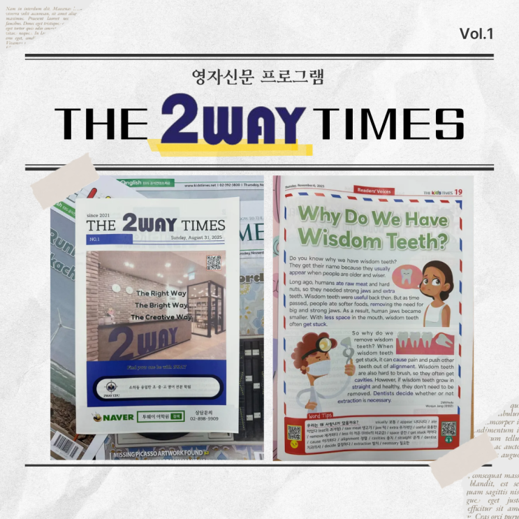 안녕하세요! 투웨이 어학원입니다. 정말 기쁜 소식을 전하게 되었어요! 우리 2Way 영어학원 학생 3명이 The Kids Times 영자신문에 직접 글을 투고하여 선정되는 멋진 성과를 이루었습니다. 투웨이 어학원에서는 학생들의 생각을 글로 표현할 수 있도록 돕는 영자신문반(News Writing Class)도 별도로 운영하며, 실제 신문 투고 경험까지 이어질 수 있게 지원하고 있어요. 이전에 업로드 된 영자신문 투고 제작 과정을 보셨을까요? 주제 선정부터 조사, 글쓰기까지 스스로 하는 아이들을 볼 수 있었습니다! 이처럼 투웨이에서는 단순한 영어를 가르치기보다, 아이들이 실제로 영어로 생각하고 표현하는 힘을 기르는 데 집중하고 있어요. 이번에 선....... <img src="https://blogthumb.pstatic.net/MjAyNTEyMDFfMTIz/MDAxNzY0NTc2ODA2OTM2.yU9SfMem5c8XZlrPrtfYpPXOeWHNEh5qrryfHoIjrpQg.FU11jsiTiVy9qto1y_sISP3RLFbTvxbjXvgg-drqmfQg.PNG/KakaoTalk_20251201_170748982.png?type=s3" />