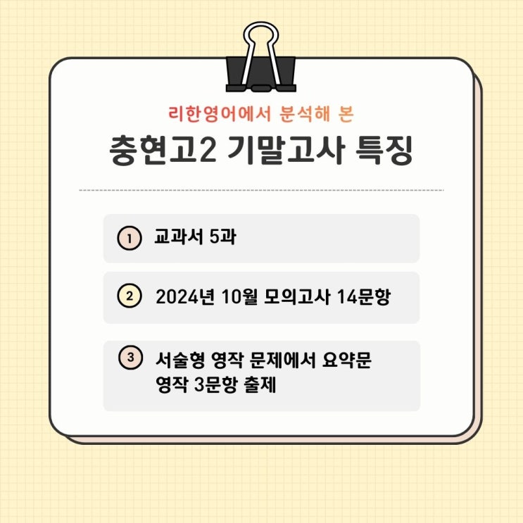 2025년 충현고2의 핵심은 항상 서술형이었습니다.객관식은 늘 나오던 유형이어서 본문과 모의고사가 변형되어 나오더라도 높은 정답률을 항상 유지하기에 서술형에서 등급을 가르기 위한 영작문제가 항상 출제 되었습니다. 2학기 중간고사까지는 어려운 영작이나 배열이 2문제 나머지 2문제는 단답형이었는데 2학기 기말은 학교 선생님들께서 시험전에 서술형이 어려울것이라고 하더니 요약문 영작3문제로 가장 어려운 난이도로 출제되었습니다. 지금 고3이 된 아이들은 광휘고에서 다른 학년에 비해 시험범위가 항상 많았습니다. 광휘고2는 1학기 때 서술형을 보통 배점30점이었는데 영작이 나와서 아이들이 어려워해서 2학기에는 서술형이 10점....... <img src="https://blogthumb.pstatic.net/MjAyNjAzMDNfNjgg/MDAxNzcyNDY4ODkyODgw.wOspgTrHQ5rbRCGt4z-9Gz7A0k43QUK7dSk1gUcWcgYg.kVFR1ZAk0PIU_WXvb1Rk7mvivGAVYAo_VW0eUALkPJog.JPEG/KakaoTalk_20251225_112233053.jpg?type=s3" />