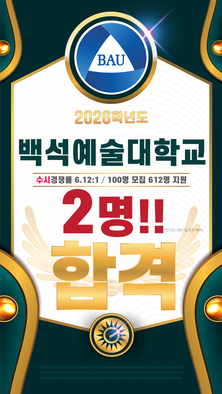 2026년도 백석예대 2명 합격!! 2026년도 백석예대 합격을 축하합니다!!! 광명가우디미술학원의 탄탄한 실기력과 높은 합격률!!! 입시미술전문학원 #광명 #철산 미술학원 광명가우디미술학원!! [상담예약: 02.2060-9746] 2026년도 백석예대 합격을 축하합니다!!! 2025년도에 이어 2026년도 수시합격 대박행진중!! 오직 단 한해!! 수시합격!! 결과로 말합니다!! 올해 최고 경쟁률!!! 86:33: 1 !! 전국 12명 모집!!! 오로지 실기 100%!! 광명 유일!!! 서울여대 수시합격!! 2026년도 서울여대 수시합격!! 2026년도 성신여대 수시합격!! 2026년도 가천대 3년 연속 수시합격!! 2026년도 상명대 수시합격!! 2026년도 호서대 수시합격!! ....... <img src="https://blogthumb.pstatic.net/MjAyNTEyMDVfNDIg/MDAxNzY0ODk0NjIyODQ2.sJ1pMaEEJgIeKEwxpncCE8TWUfx0dkUCGnV7Di9Jxhsg.rHEnKNXO21DJ-9rf2-_rdtgWYsDrLYpBL2X3oGDVTIsg.PNG/KakaoTalk_20251204_181217206_02.png?type=s3" />