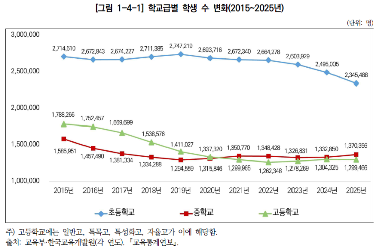 ‘학생수 절벽’의 현실 초등학교, 중학교, 고등학교 학생수 얼마나 줄어드나? 10년간 초등 입학생 13만 명 감소. 졸업생 10명 이하 학교 1863곳. 5년간 폐교 153곳. 학령인구 절벽이 뉴스가 아니라 우리 아이 교실의 현실이 되었습니다. 공터영어가 통계로 본 대한민국 교육 현장의 진실을 전합니다. 10년 전만 해도 새학기 시작 전이면 상담 전화가 불나듯 울렸습니다. 지금은 어떨까요? 다행히 저희는 꾸준히 자리를 지키고 있지만, 주변을 둘러보면 예전과 비교할 수 없을 만큼 원생이 급감해 어려움을 겪는 곳이 많습니다. ‘학령인구 감소’, ‘인구절벽’. 저희 같은 학원인들에게 이건 통계 숫자가 아니라 피부로 와닿는 현실입니다. 최....... <img src="https://blogthumb.pstatic.net/MjAyNjAyMTlfMjQy/MDAxNzcxNDczOTQ1NTc5.hUlFAbADfXQElGGrCFdNHtezzEcO6vWVFmw4YVQ-DJMg.jKlwqHtkZDE0gWLcQx-gQhARbIntUPFaTyha9v0fsacg.PNG/%C7%D0%B1%B3_%C7%D0%BB%FD%BC%F6%BA%AF%C8%AD.png?type=s3" />