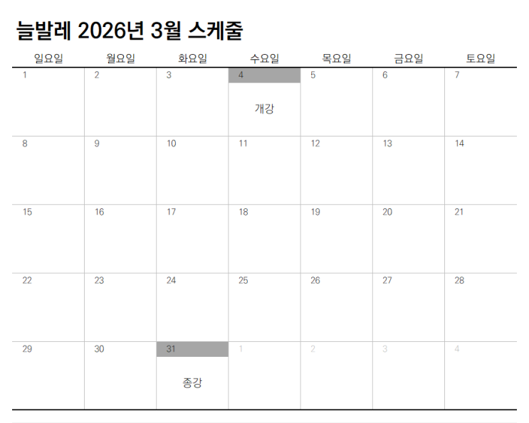 【 광명 발레학원 늘 발레 】 2026년 3월 클래스 시간표 공지