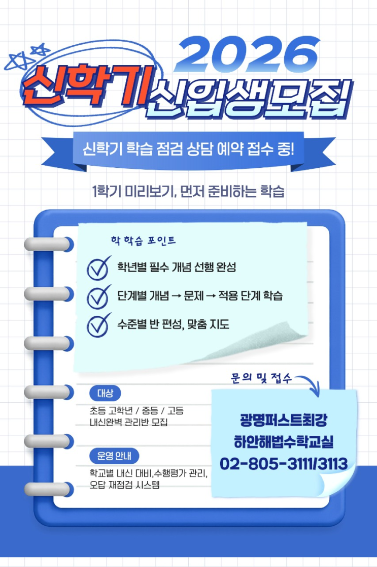 안녕하세요~ 초3에서 고3까지 책임지고 가르치는 광명최강수학학원입니다! 오늘은 신학기 공부법과 관련하여 블로그를 작성해 보려고 합니다. 많은관심부탁드립니다~!~! (진짜 끝까지 안 읽으면 손해,,~) 중학생 자유학기제를 위한 학습 노하우는 무엇이 있을까요? 난이도가 높아지고 분량도 많아지기 때문에 초등 시기와는 다른 방식에서 접근을 할 필요가 있습니다. 중학생 자유학기제 중학생 자유학기제에는 '참여형 수업'을 진행하게 됩니다. 시험이 없어서 안일하게 보내면 남는 것 없이 시간이 흘러갈 수도 있습니다. 이를 방지하기 위해 주기적으로 성취도에 대한 점검을 하는 것이 중요합니다. 중학생 국영수사과 공부법 절대....... <img src="https://blogthumb.pstatic.net/MjAyNjAyMjFfMTc1/MDAxNzcxNjQ1NjMyOTg5.kd0RN_1ZUrywAtt7q05TMSdsp6Yu5ekFDxmz9xwEIbgg.kUblcT8JUkkrdEfh9G0TrkeAHWjzyS6licCaH2J1t0Ug.PNG/image.png?type=s3" />