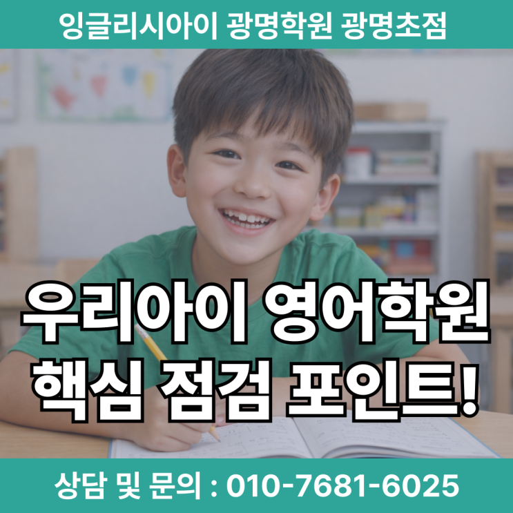 안녕하세요~ 광명초 영어학원 잉글리시아이의 Jennifer 쌤 입니다. 아이 영어를 시작하거나 옮기려 할 때, 가장 많이 받는 질문이 있습니다. "어떤 초등영어학원이 우리 아이에게 맞을까요? 학부모님들마다 고민은 다르지만,결국 하나의 공통점으로 모입니다. '우리 아이에게 맞는 교육 방향인가'입니다. 우리 아이에게 맞는 기준이 무엇일까? 겉으로 보이는 성과, 그것만으로 충분할까요? 다른 곳에서 학습을 하다 온 학생들을 상담 하다 보면 레벨은 올라가 있지만 알파벳 쓰기 조차 힘들어 하는 아이들을 만나는 경우가 많이 있습니다. 테스트 점수는 나쁘지 않은데, 기초적인 알파벳이나 기본 문장 구조를 정확히 이해하지 못....... <img src="https://blogthumb.pstatic.net/MjAyNjAyMjJfMzcg/MDAxNzcxNzU2NTE3NDcw.kEGLaSr9H4o8i3ER2M-PIUEZLWu1q7kwp1B5gLZBpgkg.0ef0eC8IpKlvtzA65Yl5TuVBphZKsfUBDAoy826iuO0g.PNG/%C1%A6%B8%F1%C0%BB-%C0%D4%B7%C2%C7%D8%C1%D6%BC%BC%BF%E4__%BA%B9%BB%E7%BA%BB-_1_-002.png?type=s3" />