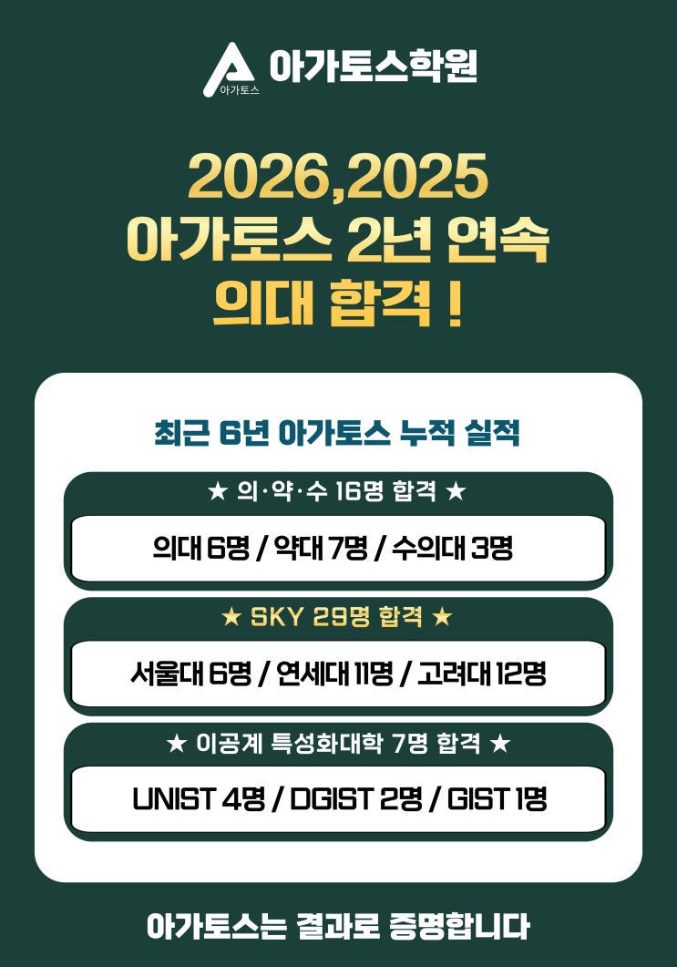 안녕하세요, 광명수학학원 아가토스 학원 인사드립니다. 안녕하세요, 광명수학학원 아가토스학원입니다! 수많은 학원이 “잘 가르친다”고 말하지만, 결국 남는 것은 합격 숫자입니다. 광명수학학원 아가토스는 그 결과로 답해왔습니다. 2026, 2025년 2년 연속 의대 합격 그리고 최근 6년 누적 실적을 보면 앞으로의 방향은 더욱 분명해지실 겁니다. ✅ 의·약·수 합격 16명 의대 6명, 약대 7명, 수의대 3명 ✅ 상위권 최정점이라 불리는 SKY 합격 29명 서울대 6명, 연세대 11명, 고려대 12명 ✅ 이공계 특성화대학 7명 UNIST 4명, DGIST 2명, GIST 1명 축적된 시스템과 관리, 그리고 상위권을 끝까지 끌고 가는 구조가 있었기 때문에 가능한 결과....... <img src="https://blogthumb.pstatic.net/MjAyNjAyMjRfMjQw/MDAxNzcxOTM5NDMyODc5.jDjfz-WnsDAiMWh7T2YA9IfMIGHOABsnfMSPTcVWwPMg.KjqvTsKPQquOQupWtks80CbGf3y7Y3sTNMcLOGX92h4g.JPEG/KakaoTalk_20260224_192726895.jpg?type=s3" />