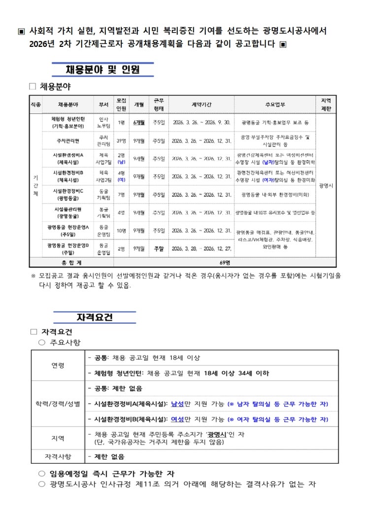 광명도시공사 2026년 2차 기간제 근로자 모집공고