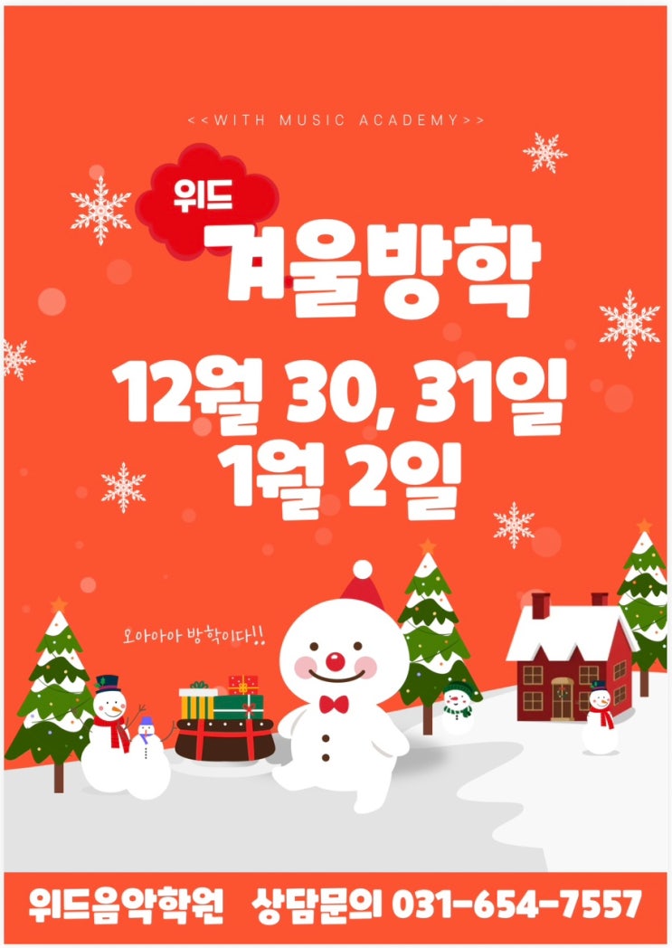 저희 위드음악학원 겨울방학은 2025년 12월 30일, 12월 31일, 2026년 1월 2일로 3일간 방학합니다~ (1월 1일은 신정으로 원래 휴강입니다.) 2026년 1월 5일부터는 정상적으로 수업이 진행되니 참고 부탁드립니다 :) 궁금한 점이 있으시다면 언제든지 학원으로 연락 주세요~!! <img src="https://blogthumb.pstatic.net/MjAyNTEyMDNfNjgg/MDAxNzY0NzM3NDg5OTQ1.V-usXJfS-dfSvALgYmAHud_v4hpG6BakNly781o1MsIg.MJjTUI7EnED3_hxF-sBcM6NXeRxgVty8zJLp0FNXD4wg.JPEG/IMG%A3%DF6247.jpg?type=s3" />